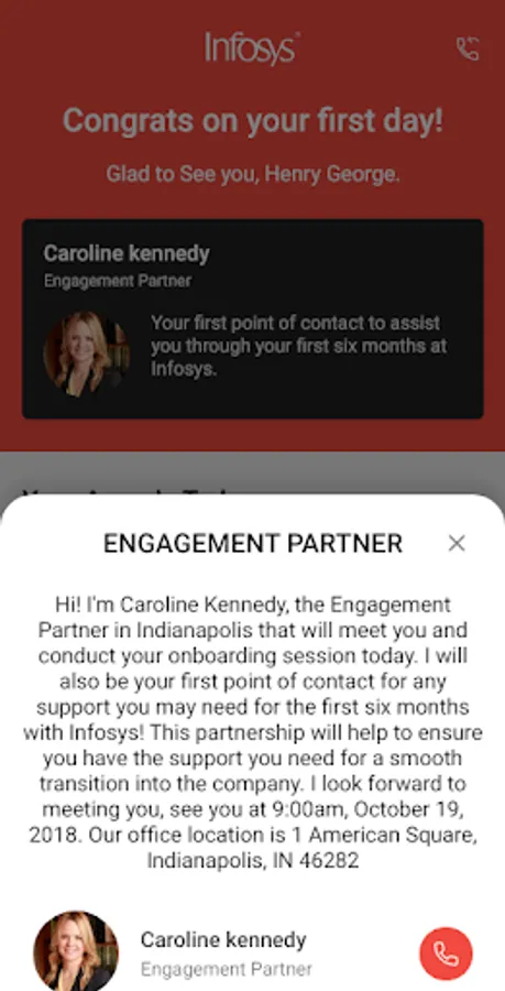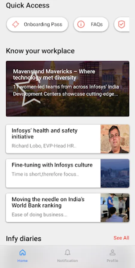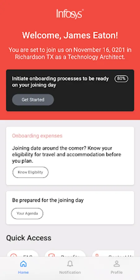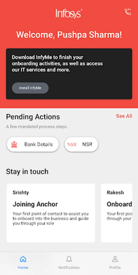 A one-stop self-help app that guides new joiners from the pre-joining stage to after they onboard - enabling a smooth onboarding experience at Infosys. It provides details on essential onboarding formalities, help with documentation and other relevant information needed by new joiners to help settle into the organization. Currently this is available for the employees hired in Australia, India, UK and USA.