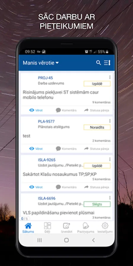 - Izmantot izvērsto meklēšanu pēc atslēgas vārdiem, kopsavilkuma, piešķiršanas, pārskata, statusa, pielāgotajiem laukiem.