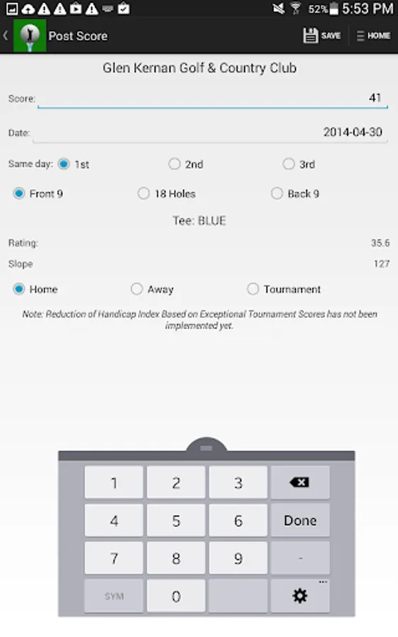 4. Calculate handicap for a specific course and maximum stroke (net double bogey).
