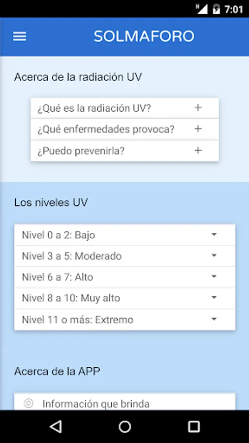 Its purpose is to help people protect themselves from ultraviolet light. Excessive exposure to this radiation causes sunburn, eye damage, skin aging and skin cancer (more information in the questions section of the app).