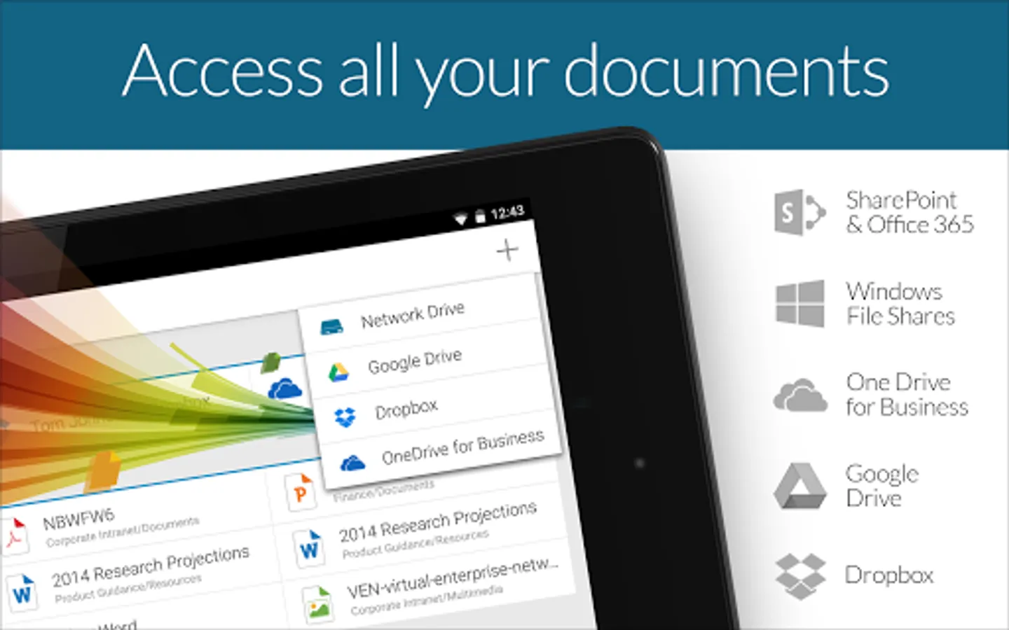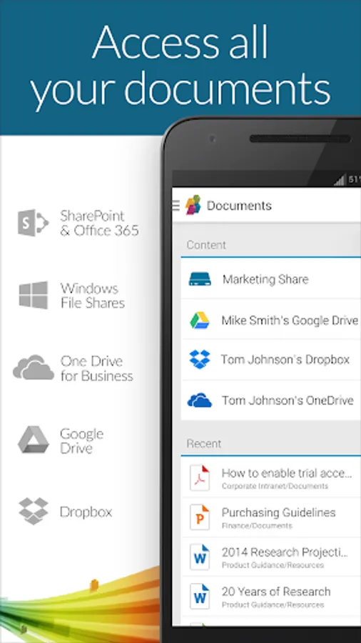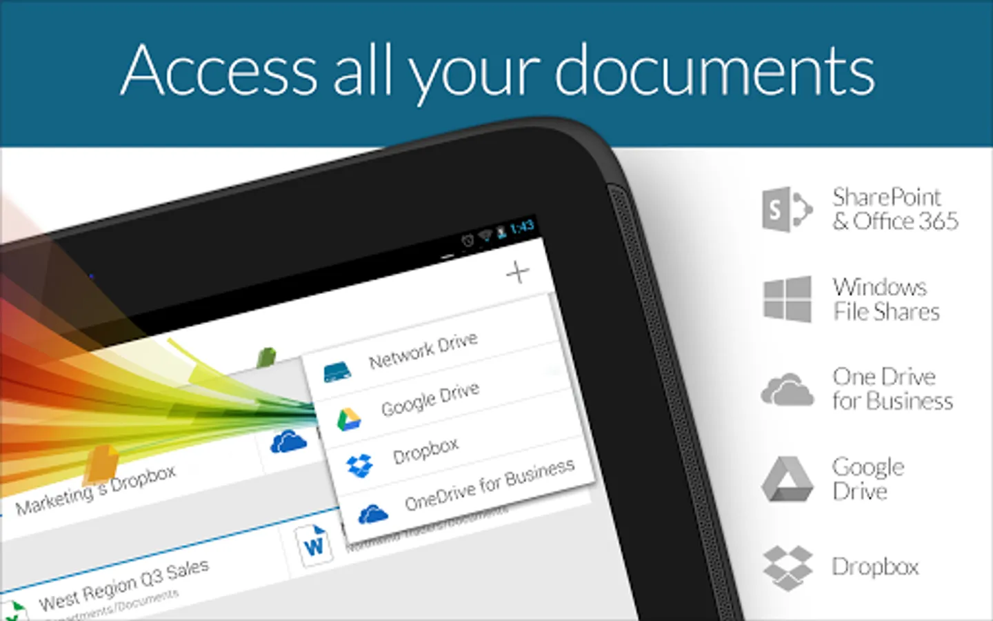 • Access additional storage services, like OneDrive for Business, Google Drive, or Dropbox. Plus, you can also access Network drives shared by your colleagues.