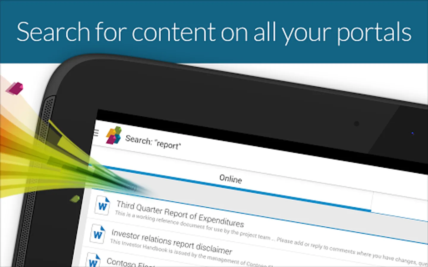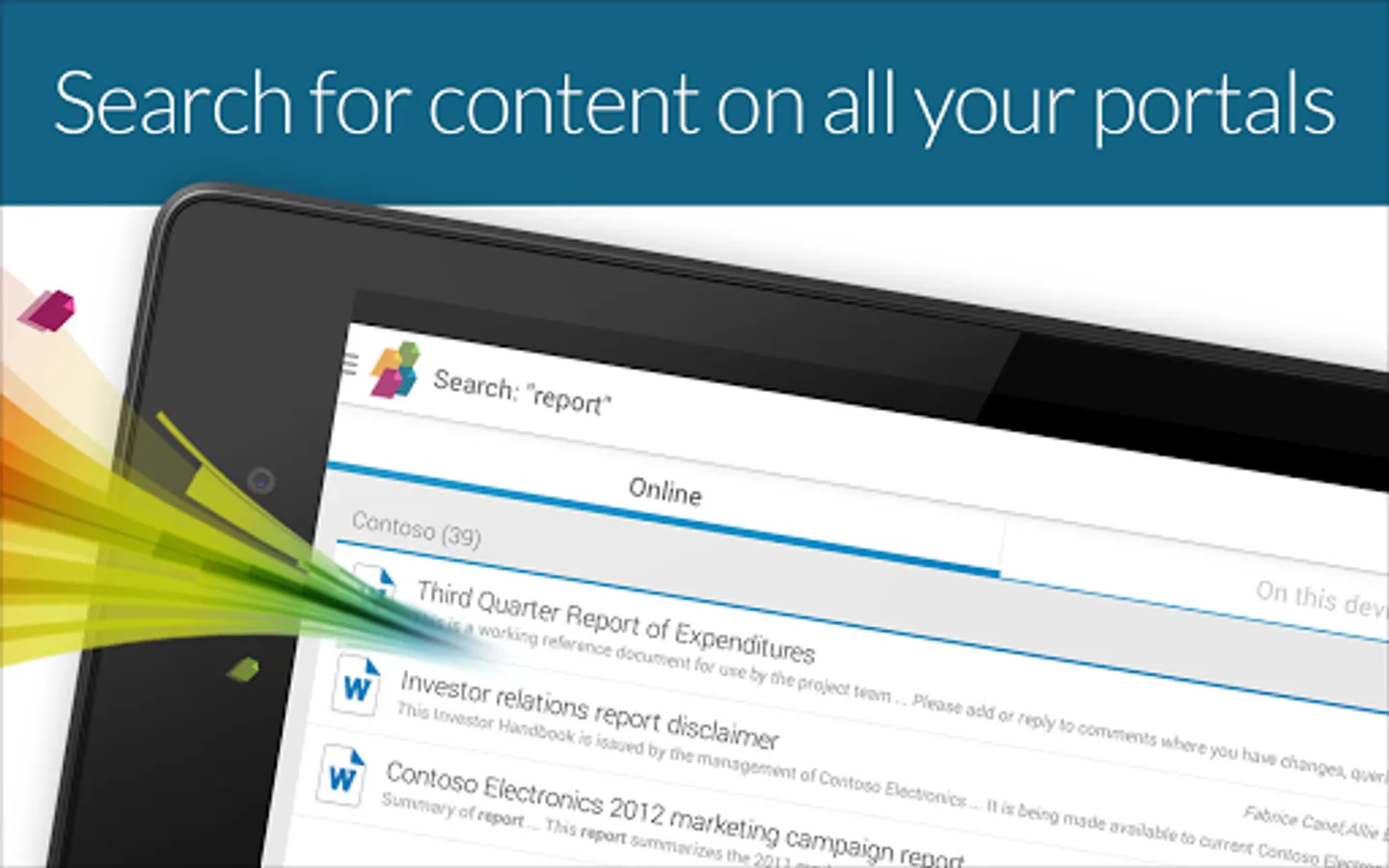 • Discover information buried in SharePoint with Enterprise Search. Search all your portals and have your content at hand with quick access to Recent Content and Favorites.