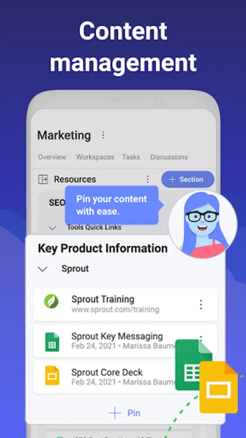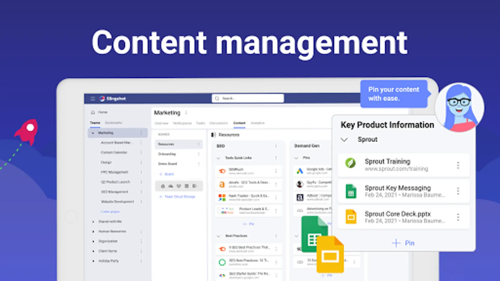 In Slingshot, you can separate your teams, projects, and even departments in Workspaces and create a perfect workflow with all tasks, chats, and needed content easily accessible. Slingshot allows you to bring all necessary content together – from any cloud storage like Google Drive, OneDrive, SharePoint, Box, or Dropbox, you can upload and pin your content, so you never lose track of the most updated files.