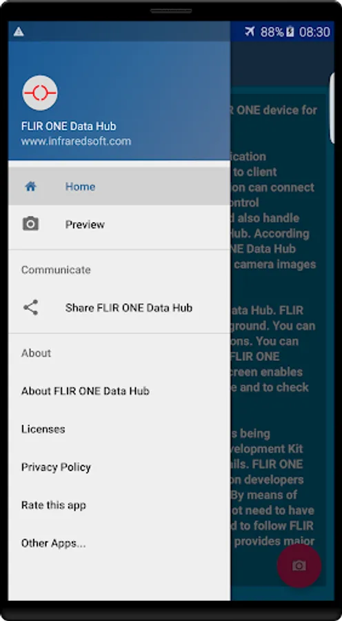 FLIR ONE Data Hub is an Android application designed to provide a FLIR ONE server to client Android applications. A client application can connect to FLIR ONE Data Hub, and can send control messages. The client application could also handle the messages sent by FLIR ONE Data Hub. According to the client control messages, FLIR ONE Data Hub transmits requested FLIR ONE thermal camera images or data to the connected client app.