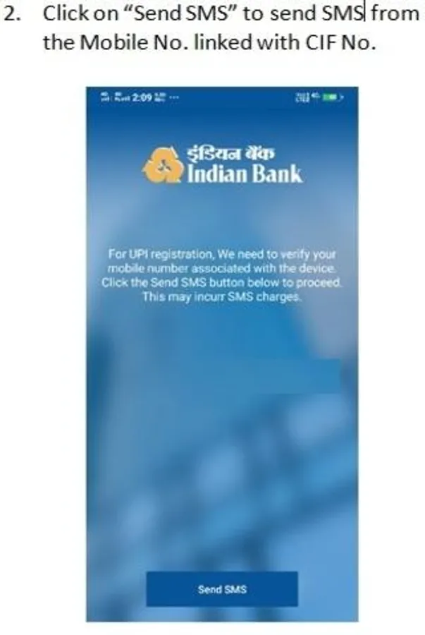 • Tap “Send SMS” to verify your mobile number. An SMS will be sent from your mobile for verification. In case of Dual SIM, Users need to select the SIM registered with Bank Account for verification.