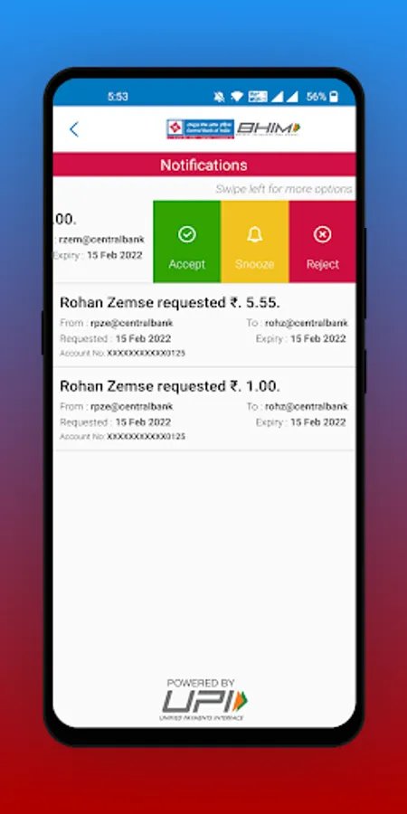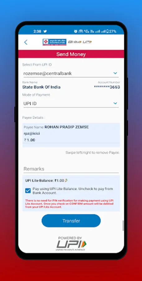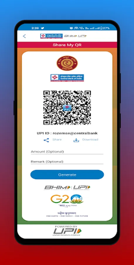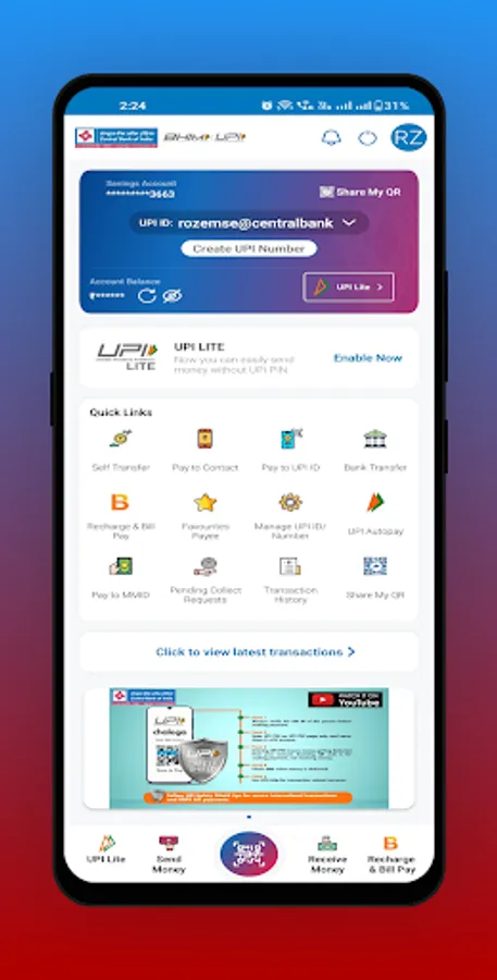 Central Bank Of India offers Unified Payment Interface (UPI) application for the customers to register with the bank and link their accounts of other banks as well. Customer shall be able to Pay and initiated collect money requests to their beneficiaries. Payment Address is an abstract form to represent and identify the account details, and account details remain confidential. By adding accounts of different banks, customer can manage the account in single application.