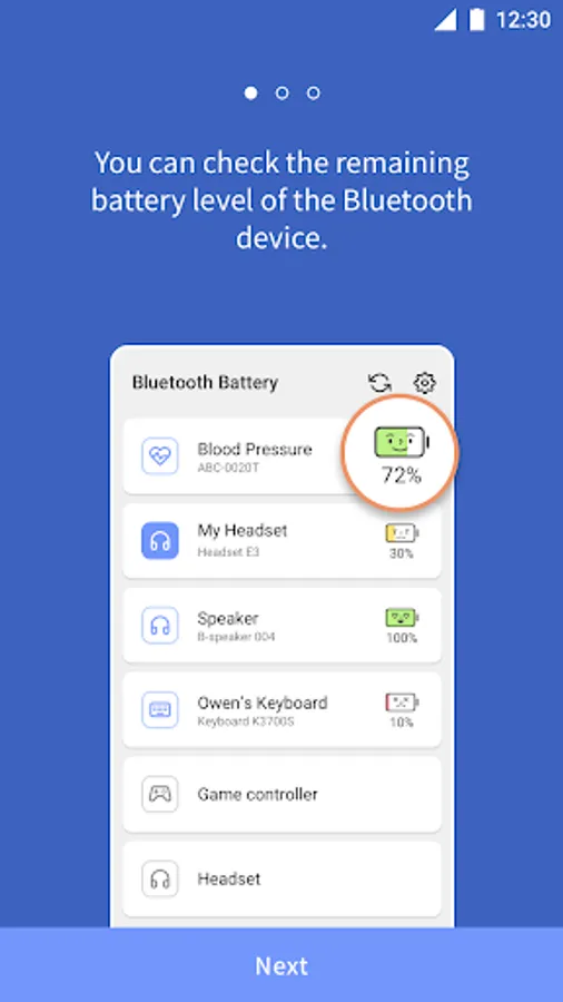 Bluetooth Battery checks the remaining battery level of the Bluetooth devices connected to the smartphone, changes pairing device, and automatically start a specific application for each set Bluetooth device.