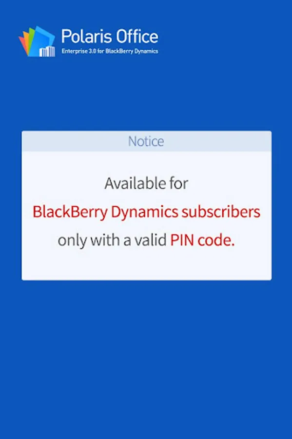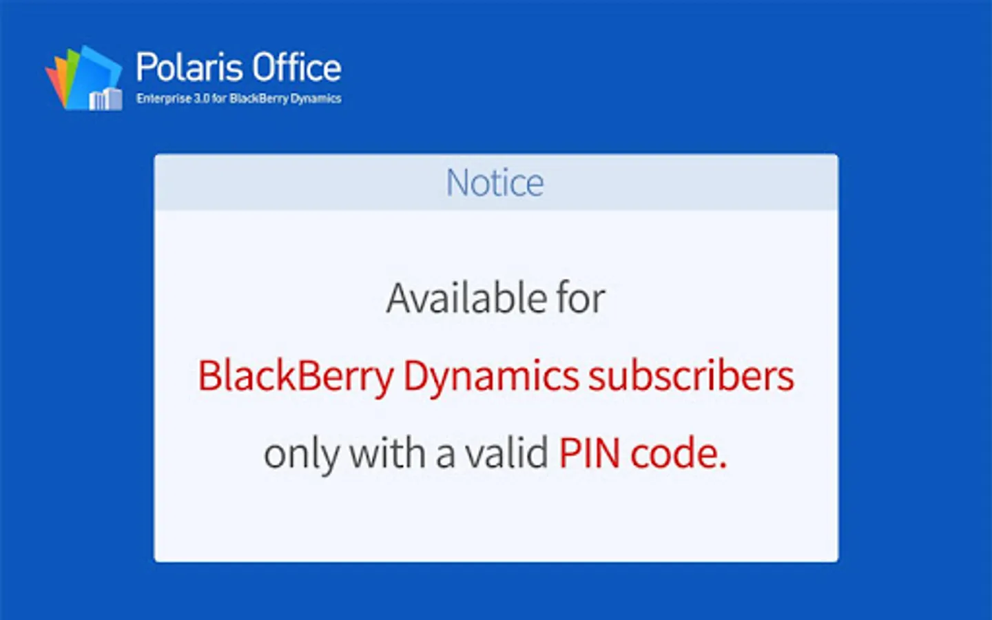 POLARIS Office for BlackBerry is an enterprise application and not meant for consumer use. This application requires that BlackBerry Dynamics servers are setup in your Company’s IT organization. INFRAWARE does not provide access key for consumer users.