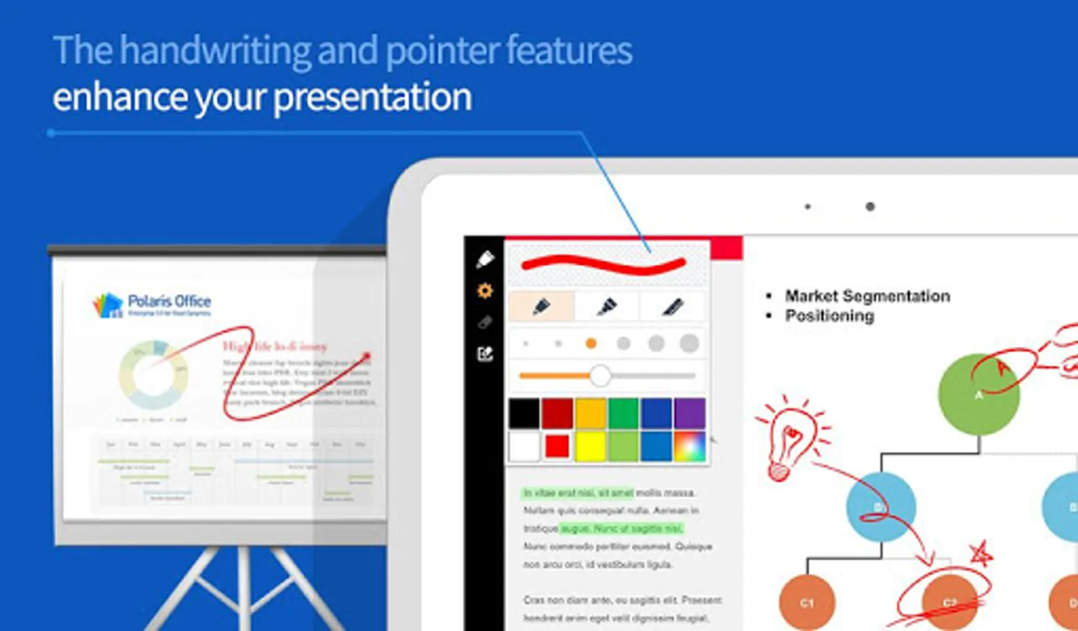View Microsoft Office documents / View .pdf and .hwp files / Support Quick Scroll / Slideshow mode / Page transition animation effects for slide shows / Pointer and drawing for slideshows