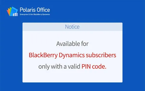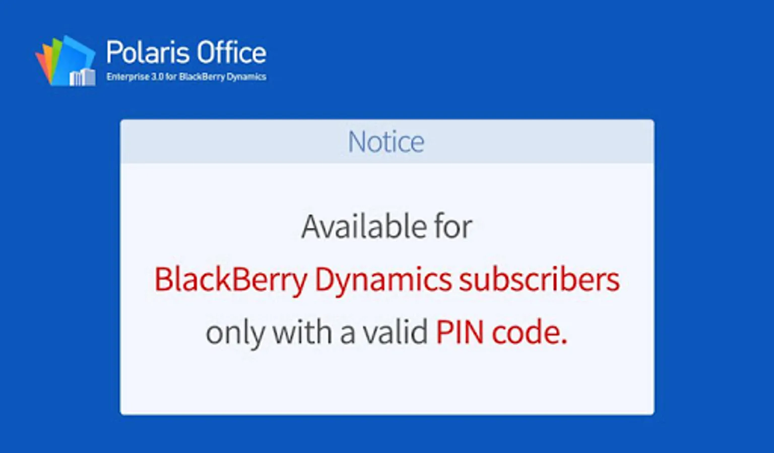 POLARIS Office for BlackBerry Dynamics is an enterprise application and not meant for consumer use. This application requires that BlackBerry Dynamics servers are setup in your Company’s IT organization. INFRAWARE does not provide access key for consumer users.