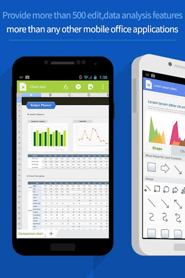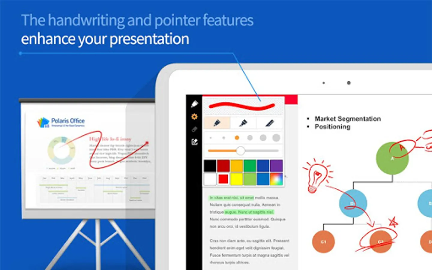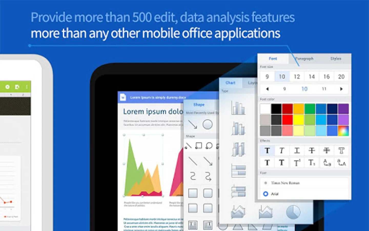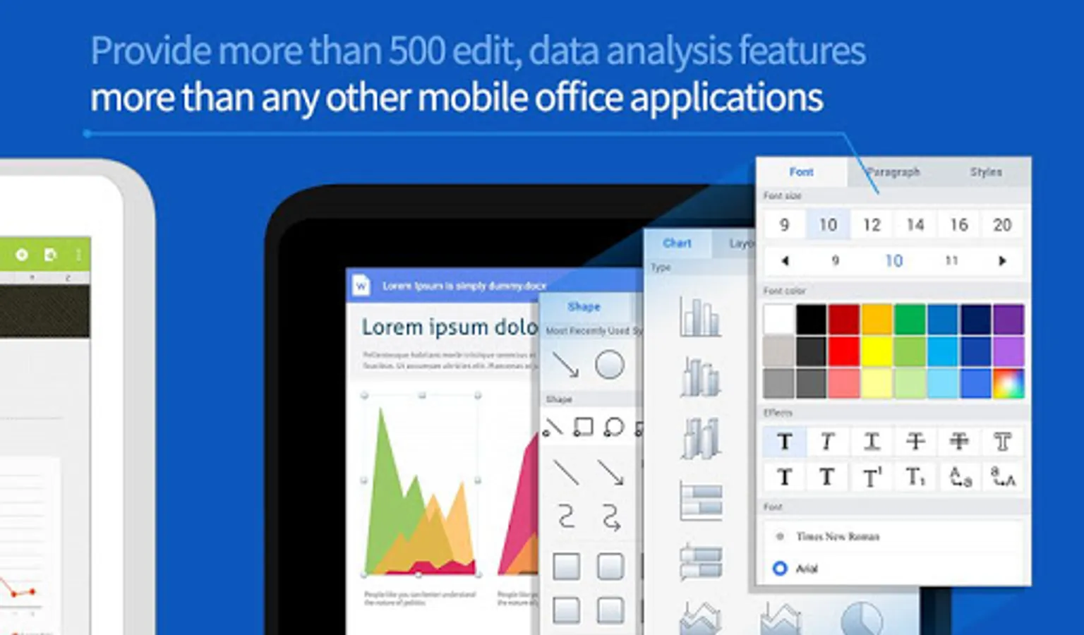 View and edit Microsoft Office documents / View .pdf and .hwp files / Support Quick Scroll / Support around 80 types of Smart Arts & 18 types 2D, 3D charts / Provide more than 300 editing features / Useful & various templates for new creation / Slideshow mode / Page transition effects for slide shows / Pointer and drawing for slideshows