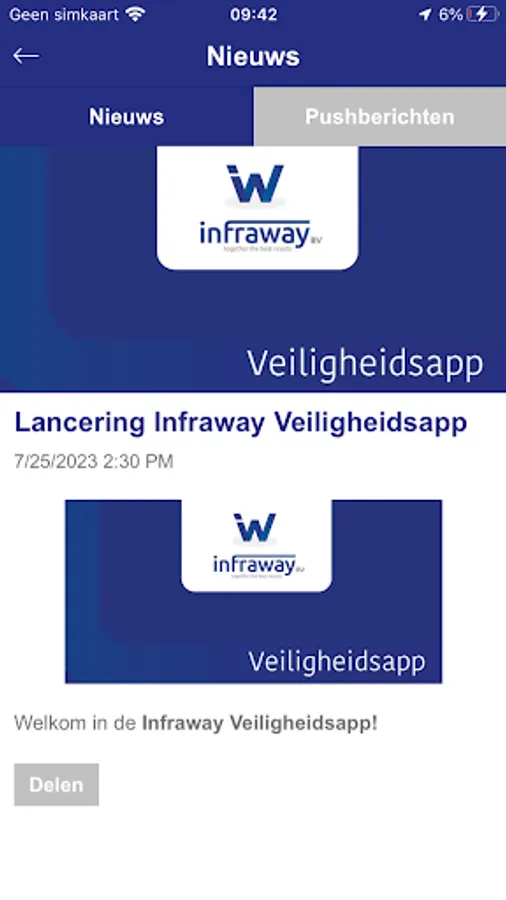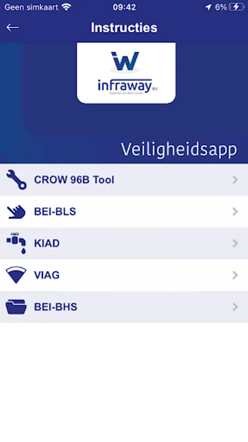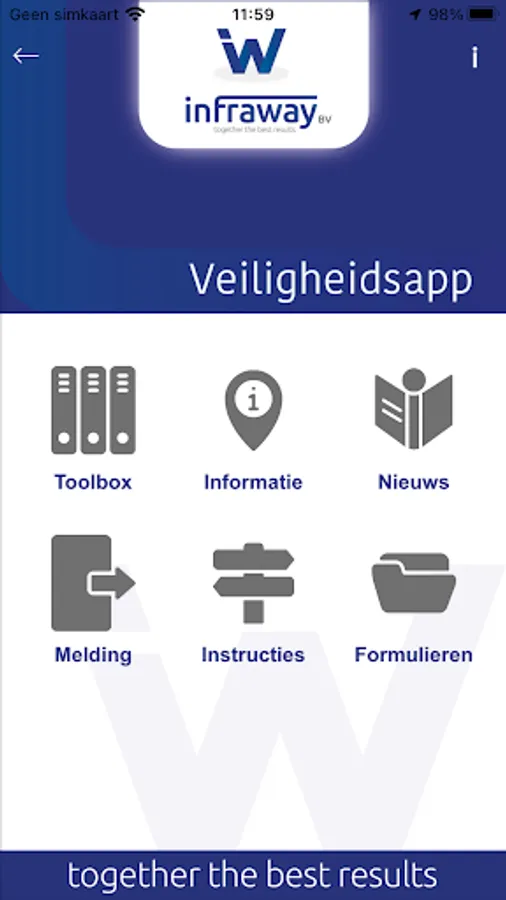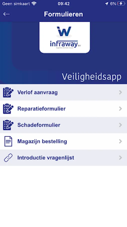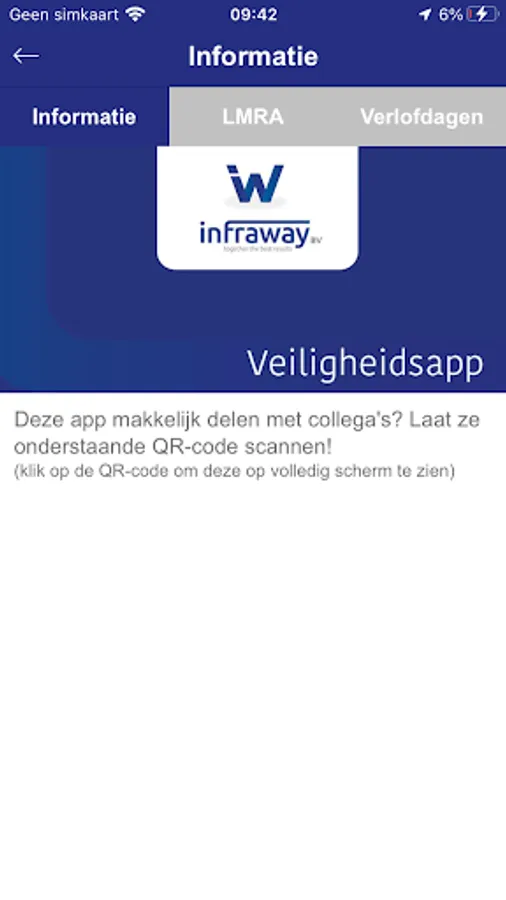 This is Infraway's Safety App. This contains everything about what to do in the event of unsafe situations and unsafe situations can be reported. New information about safe working is regularly placed in this app and workplace inspections can be carried out.