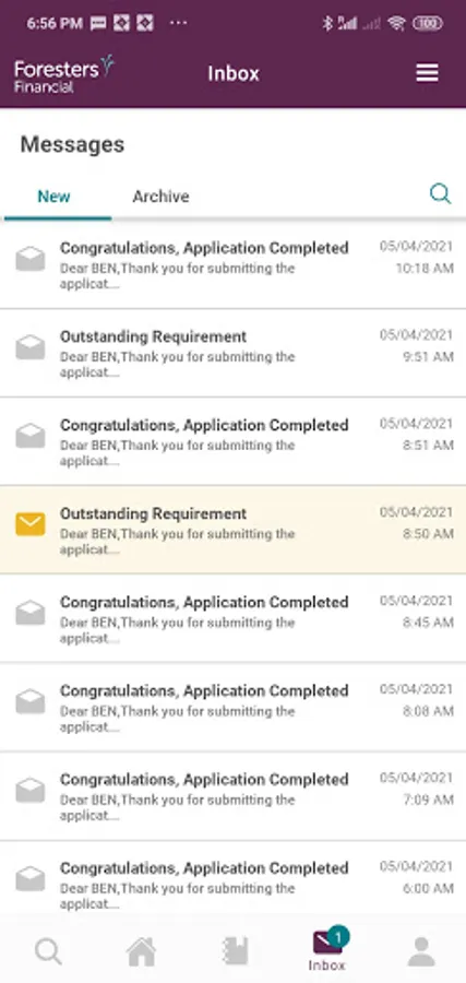 * Inbox to search and view details of recent outstanding requirements and completed applications