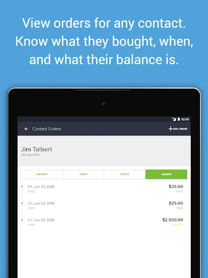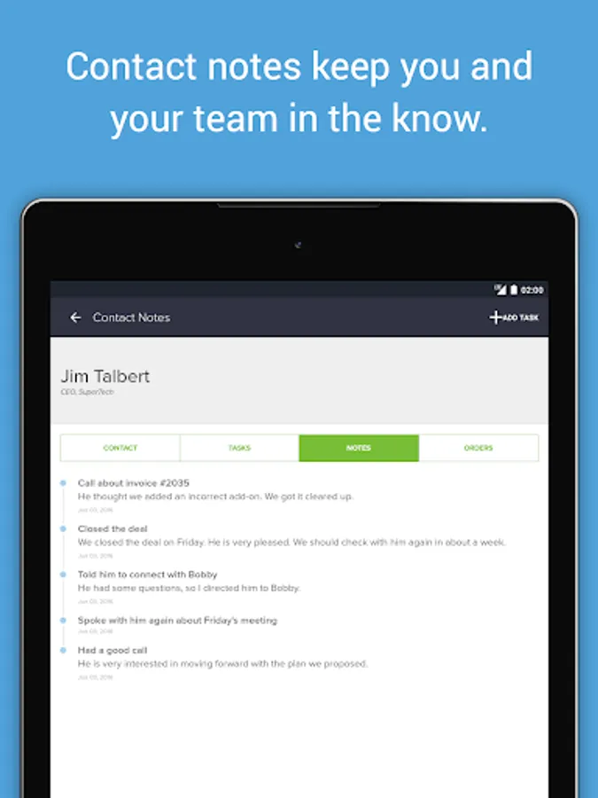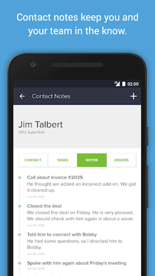 • Capture lead sources by adding new contacts and creating detailed notes for each, including: name, company, job title, phone numbers, emails, and billing and shipping addresses.
