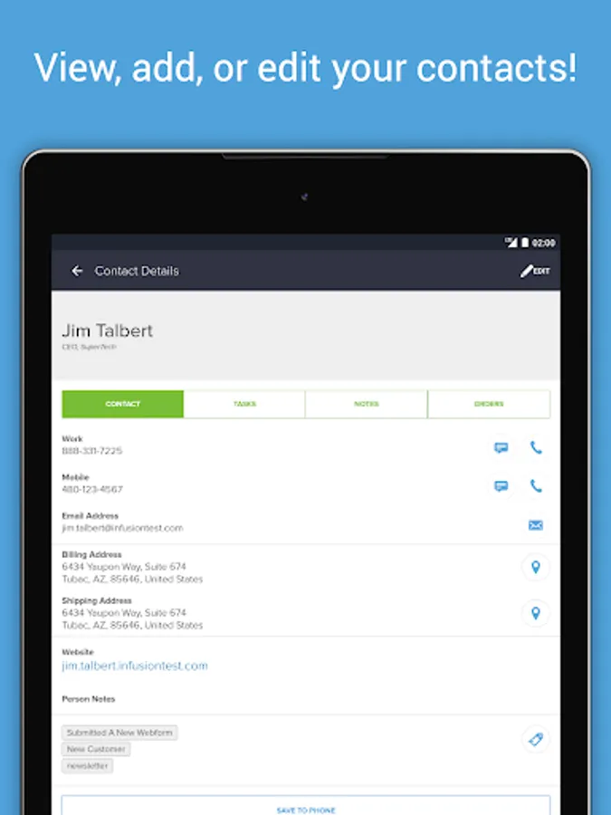 • Add a contact’s information directly to your phone address book with the ‘Save to Phone’ feature.