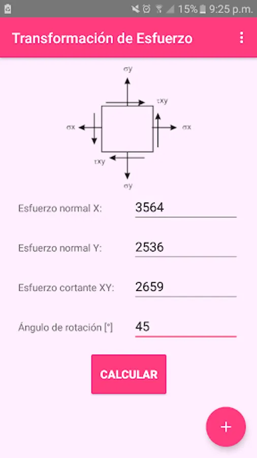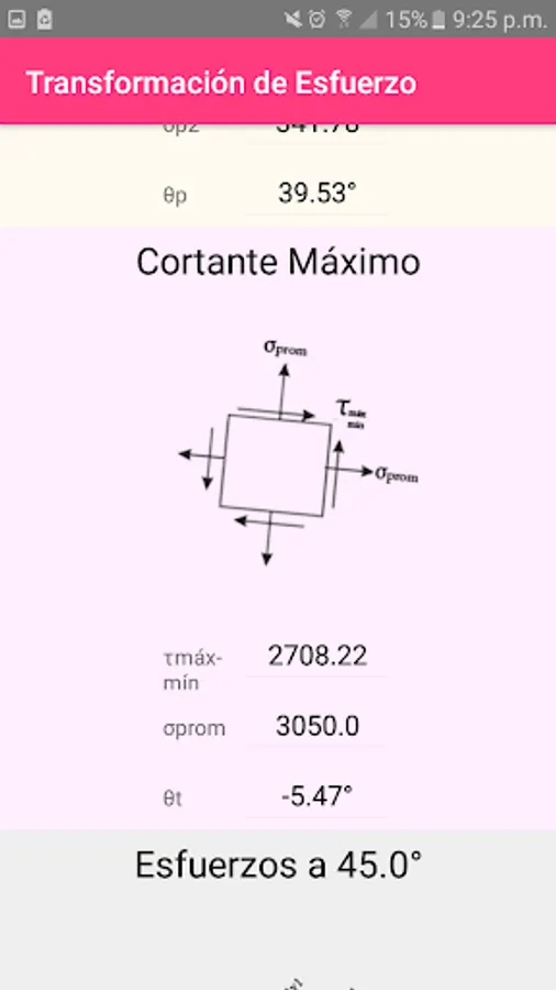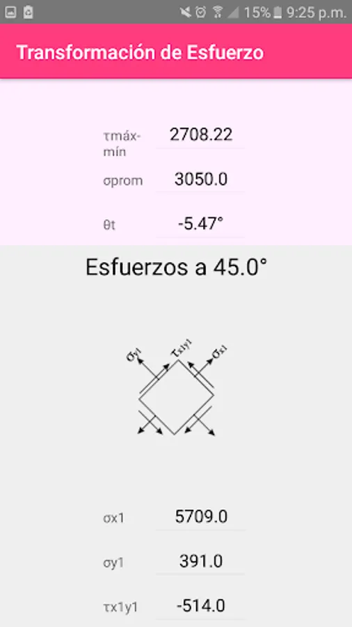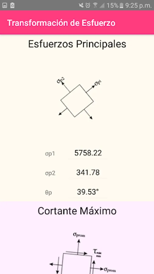 "Transformation Effort" allows you to get the main efforts, the shear stress maximum and minimum, average effort, the directions of the principal planes and cutting. You can also obtain normal and shear stresses on an inclined plane specified.