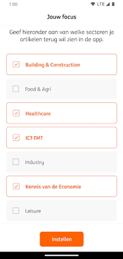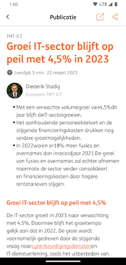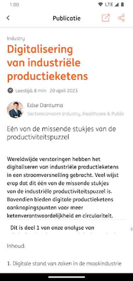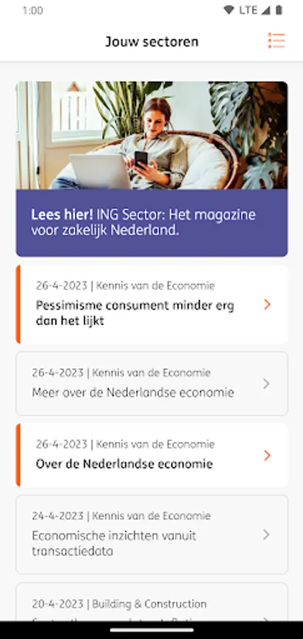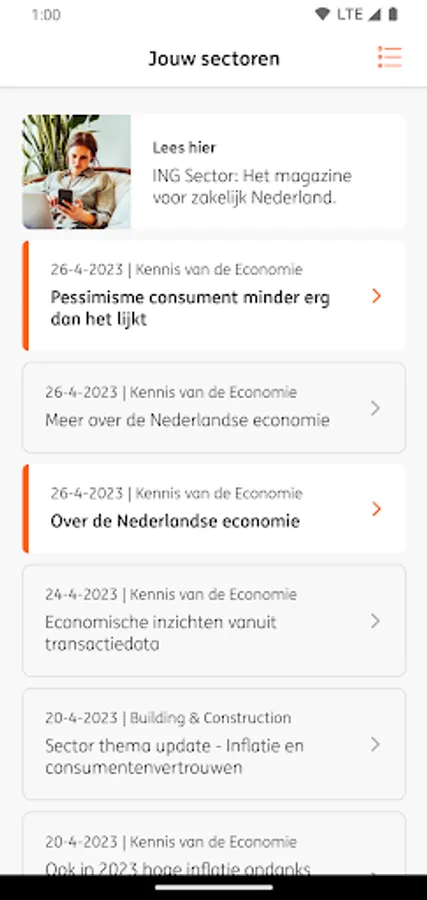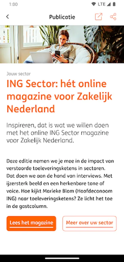 With ING Sector Insights you can choose from which sectors or themes you want to receive a push message with the latest insights. Besides this, you are enabled to share these insights with your own smart phone and add your personal thoughts towards the receiver. SharING is carING