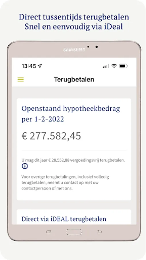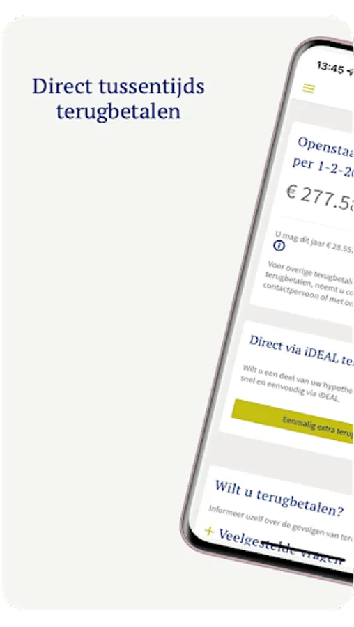With the MijnWUB app you have access to your current mortgage data. You can also make a number of changes quickly and easily. For example, you can: