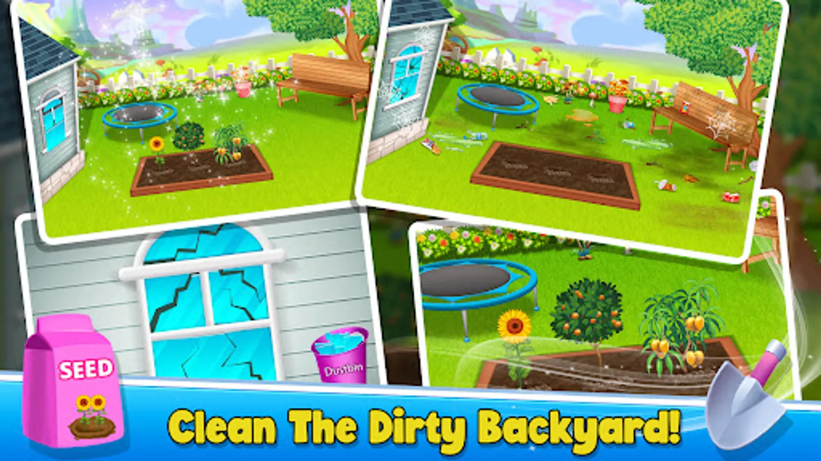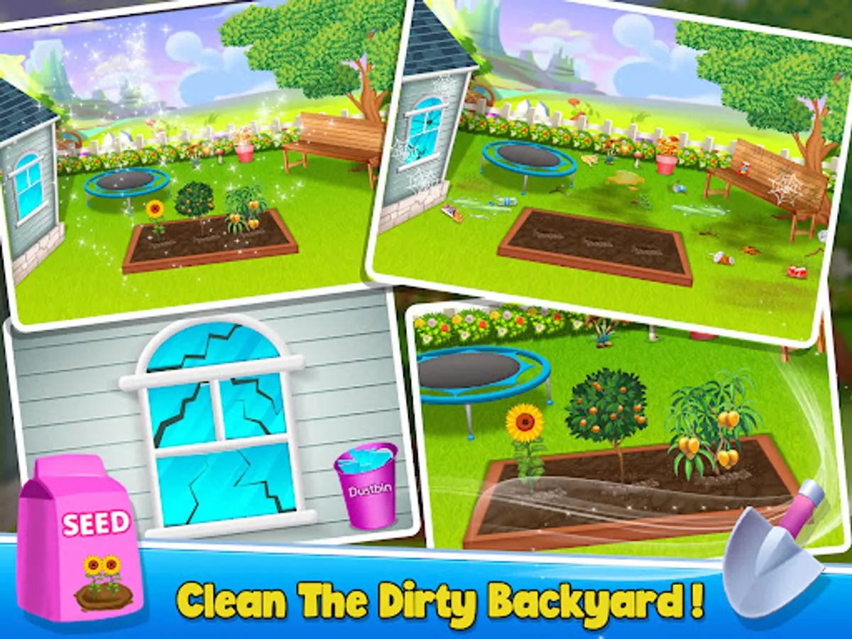 - Grow Different Different Plants in Your Backyard and collect grabages from the backyard lawn. and fix the broken window.