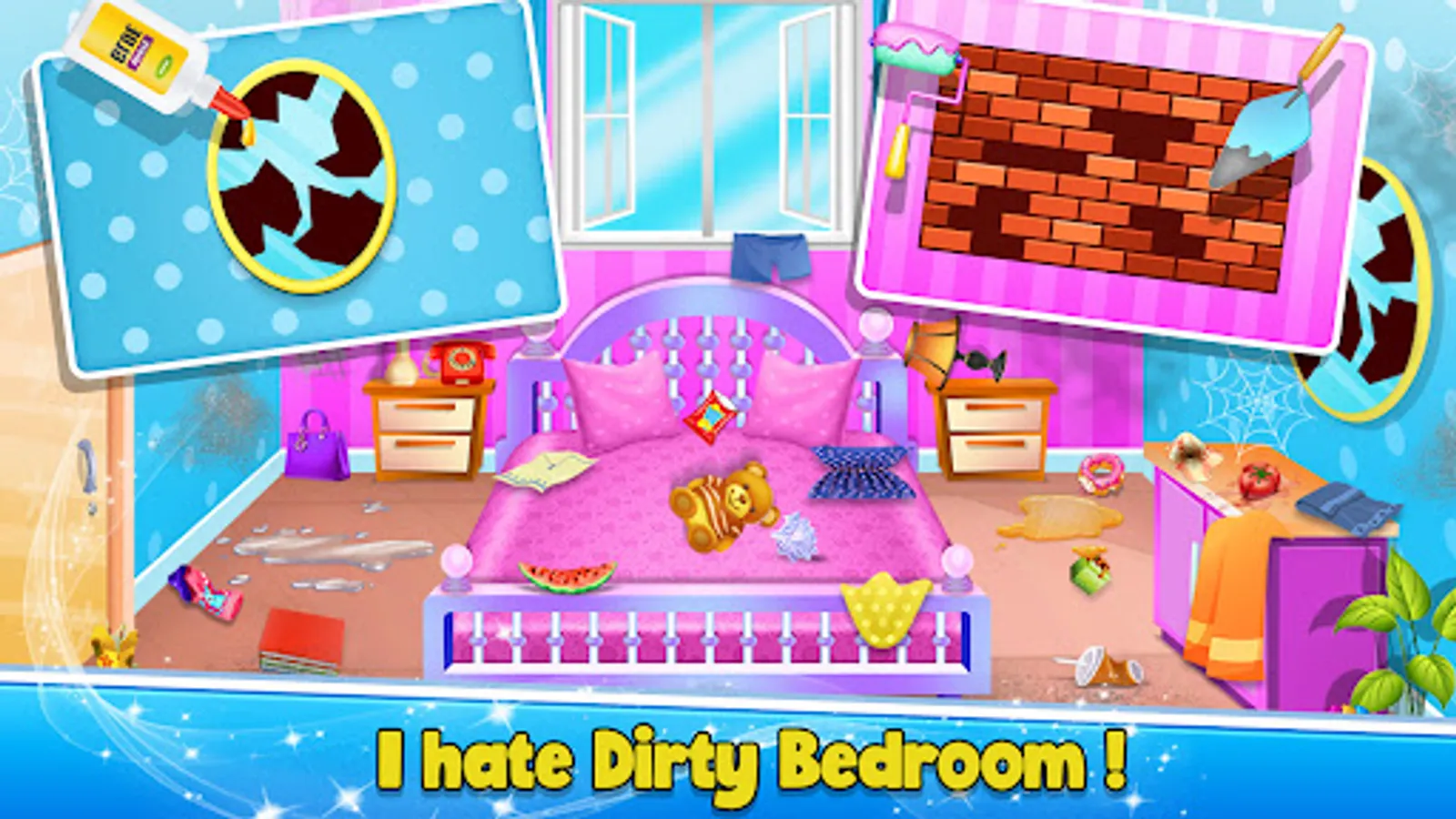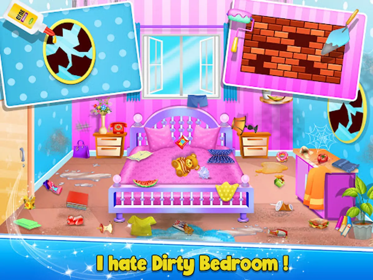 Do you like to cleanup messed up places? so Welcome to your sweet Home cleanup World, and keep your Messy Room clean. Messy Room - Home Cleanup Game Has varieties of House Cleaning Activities and Repairing Tasks.Try to cleanup from walls to doors and from floor to ceiling. Enjoy Cleaning spider web, collectting trash in dustbin, Wipe the Floor Using Mop, And Arrange Misplaced things on their right place.