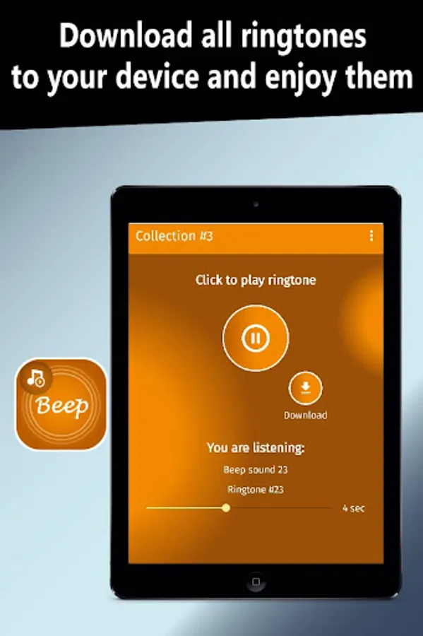 You are now in the Play Store available to download our beep ringtones application. Download it right now and enjoy all the content. It has an excellent collection of ringtones just choose your favorite ringtone and customize it on your Android device to use them either as ringtones, SMS tones, alarms or notifications.