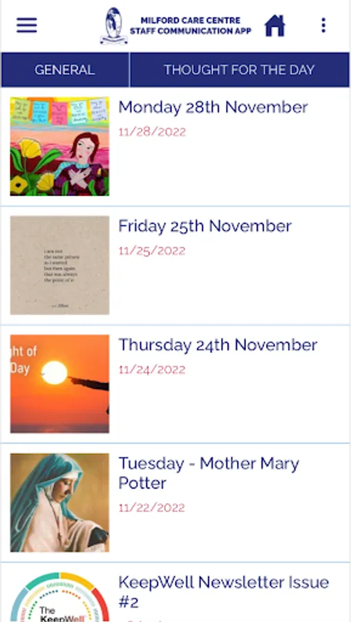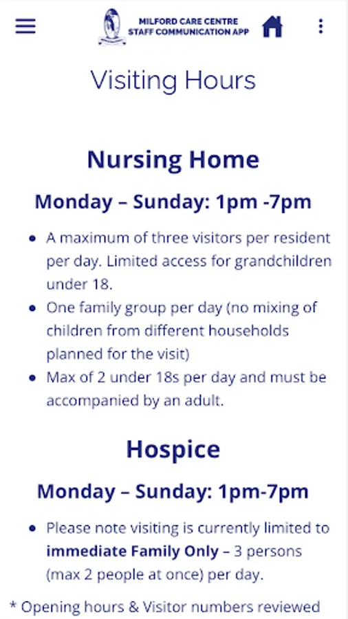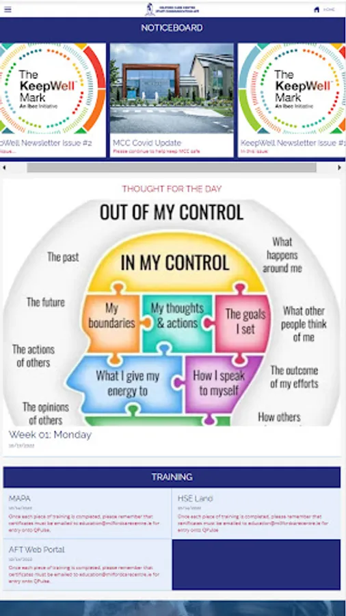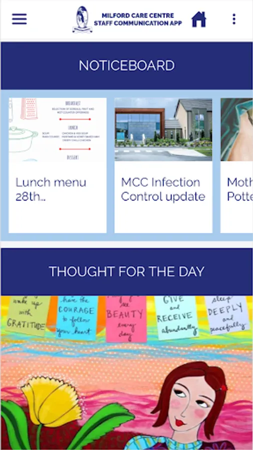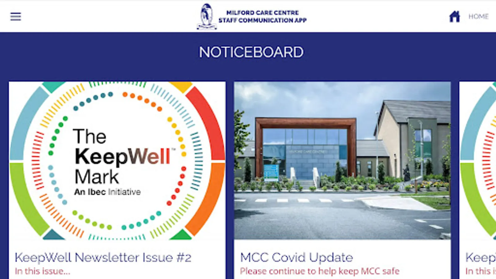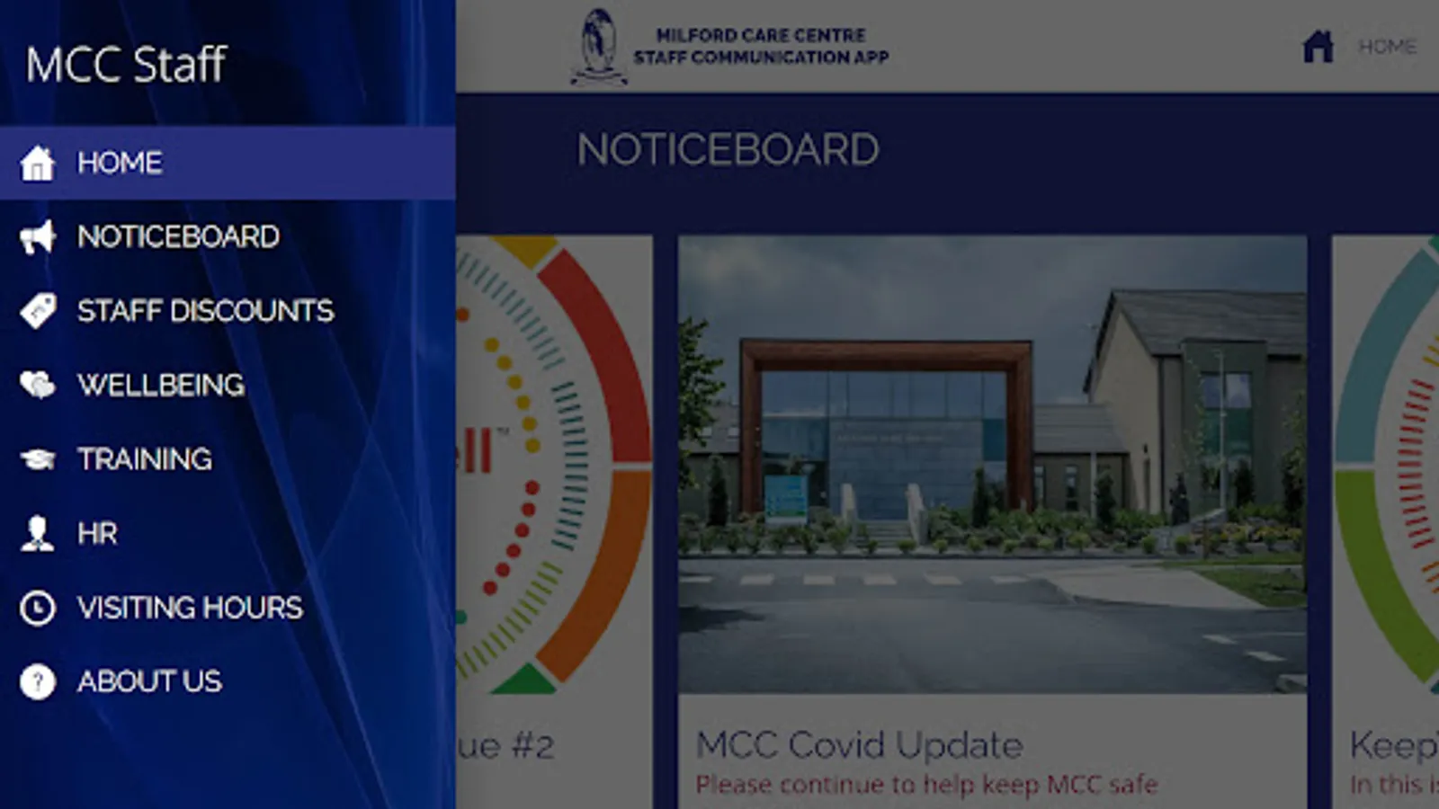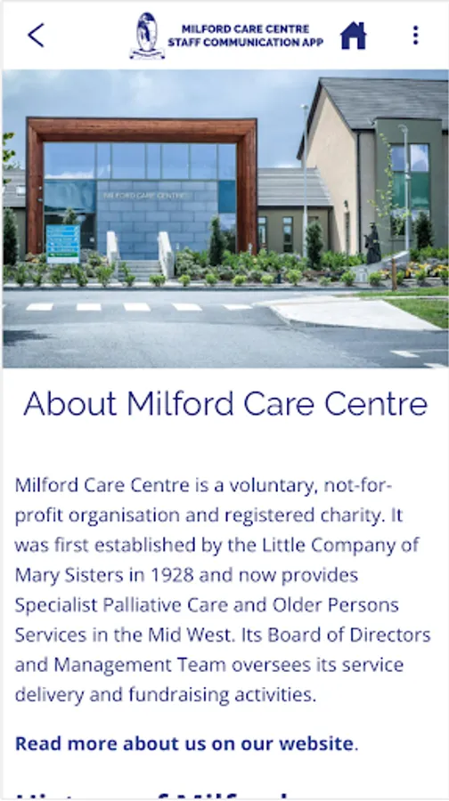 An employee communication app for staff members of the Milford Care Centre, in Limerick, Ireland. Includes health and wellbeing advice, staff discounts, news, HR forms, and more.