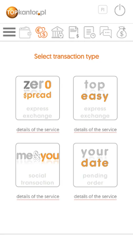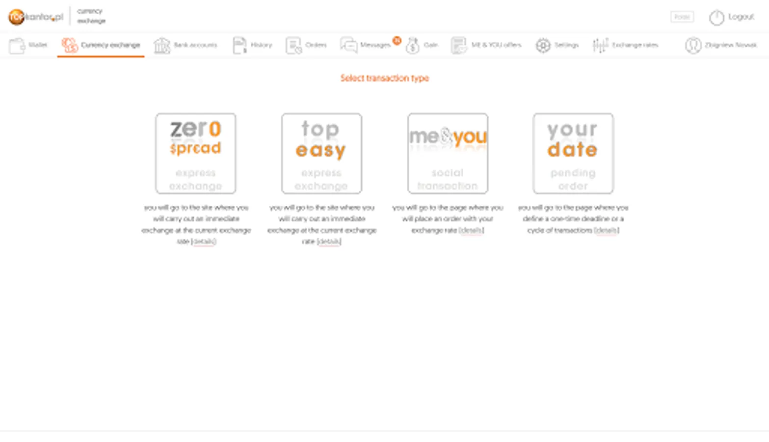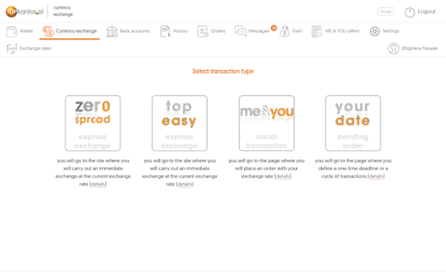 TOPkantor.pl is the cheapest and the best online currency exchange. As the first and only exchange office, we offer express exchange of currencies without spread ZERO $PREAD as well as ME & YOU social exchange with the lowest commission on the market (from 0.05%). Thanks to our online currency exchange platform, making transactions is possible from anywhere in the world. As part of no-cost access to the transaction panel, we offer you a range of additional services. If you want to exchange currency at a specific time or you want to set a loan repayment schedule, use the option YOUR DATE, so that all currency exchange operations will take place automatically. TOPkantor.pl will provide you with maximum convenience.