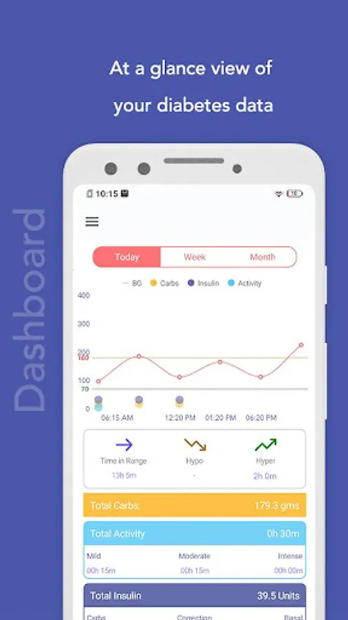 Provides At-a-Glance Report View /Dashboard on intake of carbohydrate, insulin dose, activity and BG level to care team members.