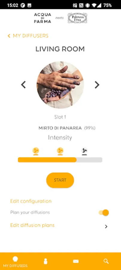 Use the app to initiate or stop scent diffusion, select your fragrances and set intensity.