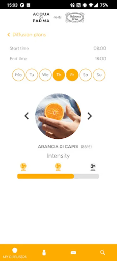 Remotely access and manage your device even when you are away from home. Program and set diffusion of different fragrances at desired times with weekly schedules, and select different options of intensity.