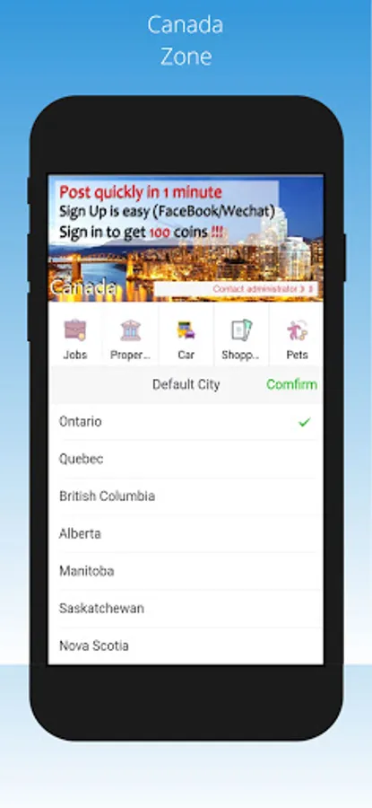 Canada Classifieds App like Craigslist for advertising with sections about jobs, housing, sales, wanted items, services, community services, shows, resumes...