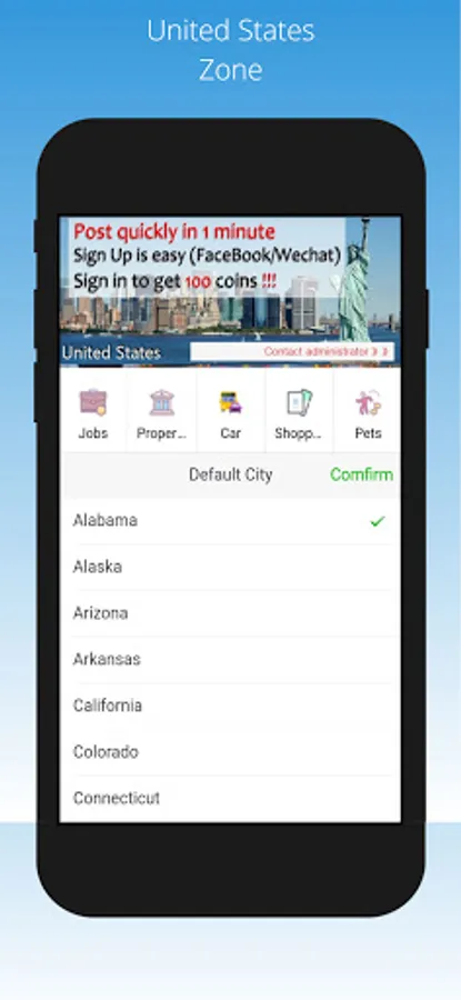 Classifieds App like Craigslist for advertising with sections about jobs, housing, sales, wanted items, services, community services, shows, resumes...