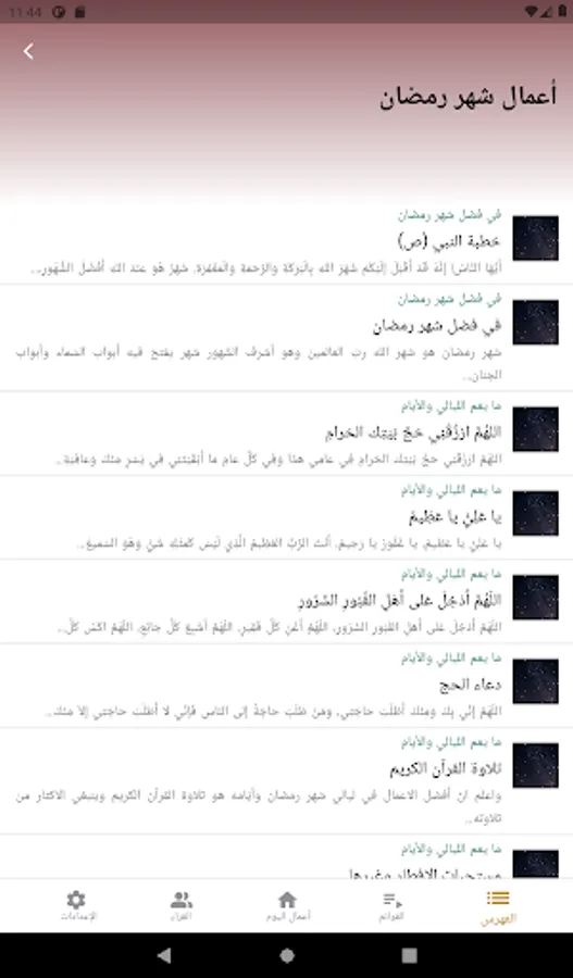 * Supplications: It contains the monthly supplications, in which the supplications of the month are displayed automatically according to the current month, such as the supplications of the month of Rajab, the supplications of the month of Shaban, and the supplications of the month of Ramadan.