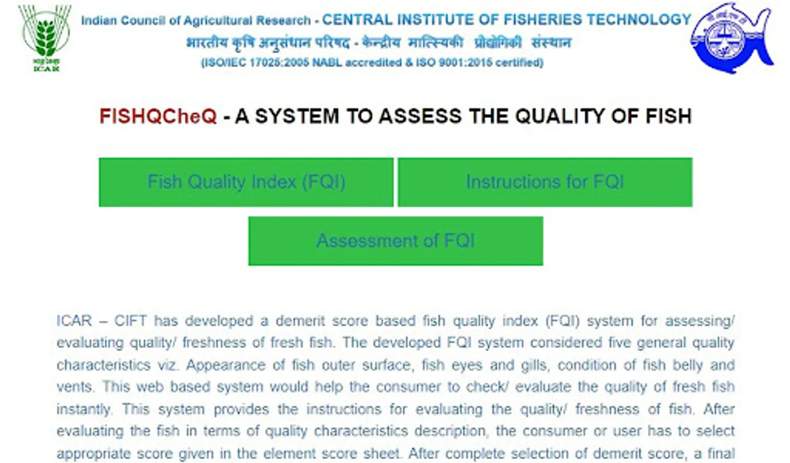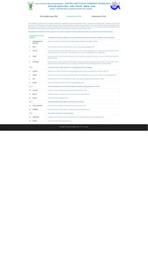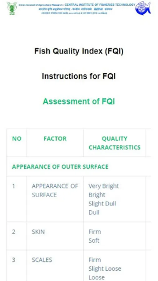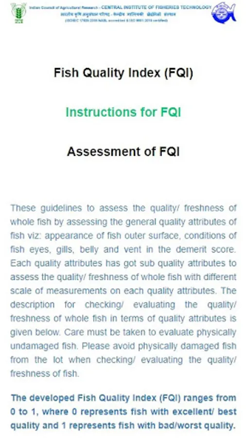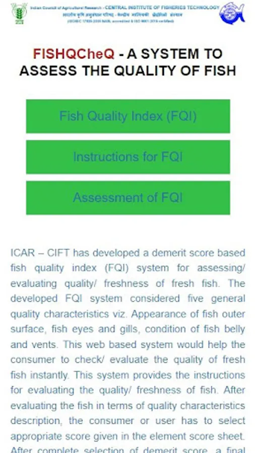 ICAR - CIFT has developed a demerit score based fish quality index (FQI) system for assessing/ evaluating quality/ freshness of fresh fish. The developed FQI system considered five general quality characteristics viz. Appearance of fish outer surface, fish eyes and gills, condition of fish belly and vents. This web based system would help the consumer to check/ evaluate the quality of fresh fish instantly. This system provides the instructions for evaluating the quality/ freshness of fish. After evaluating the fish in terms of quality characteristics description, the consumer or user has to select appropriate score given in the element score sheet. After complete selection of demerit score, a final fish quality index (FQI) would be computed automatically along with the quality description of fish.