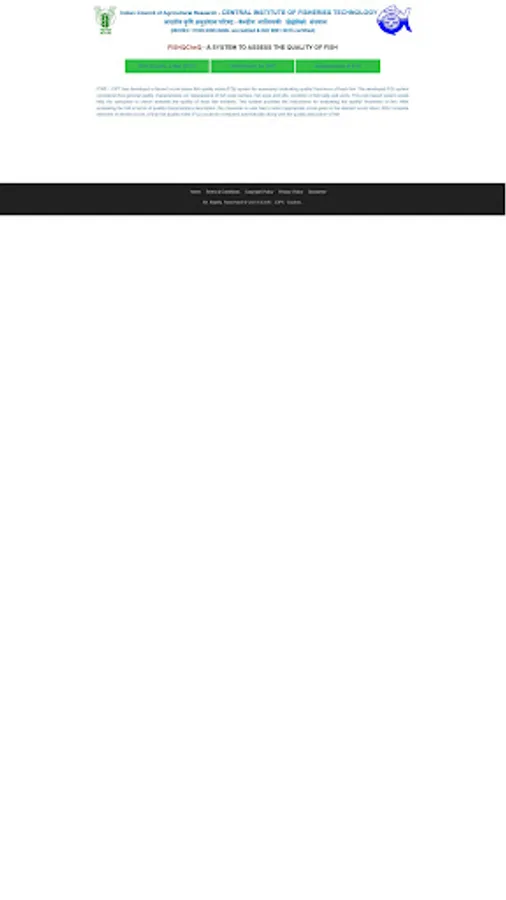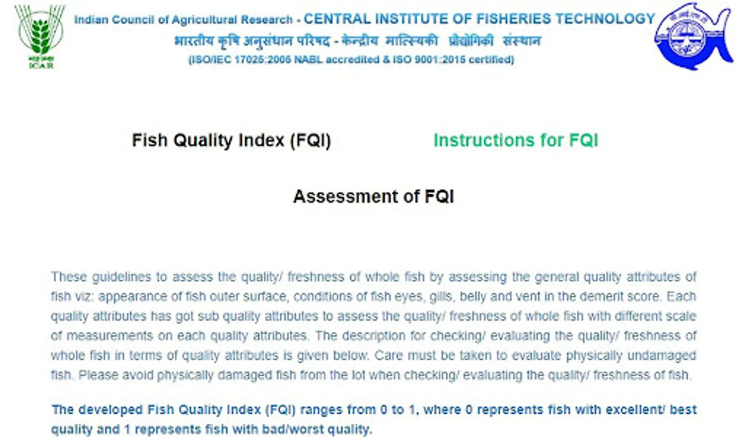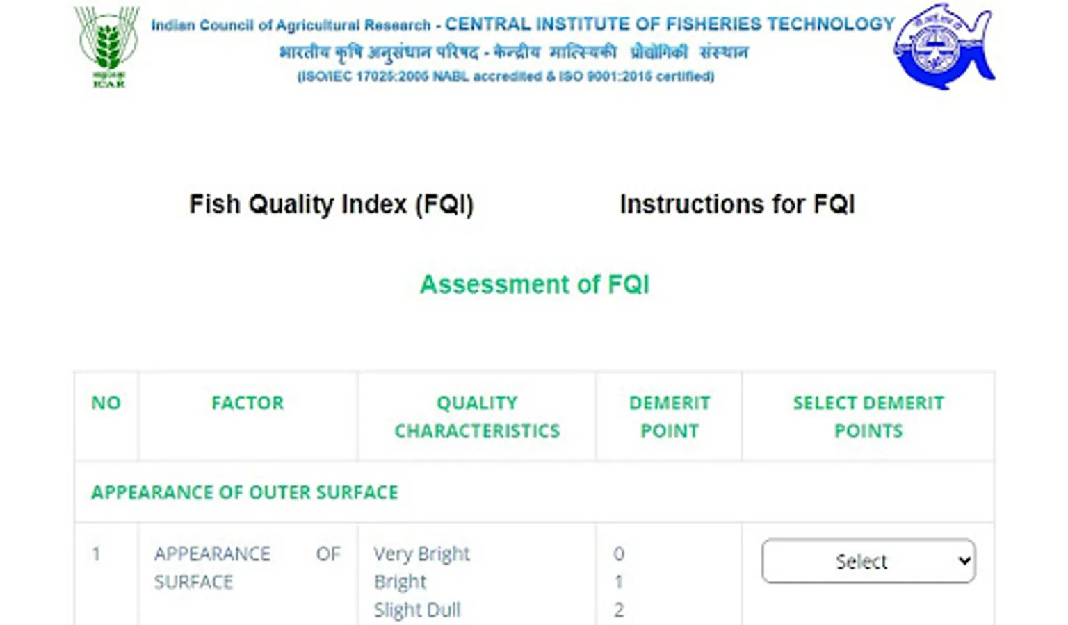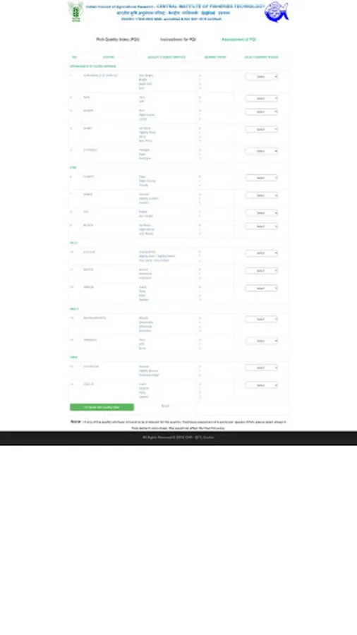 ICAR - CIFT has developed a demerit score based fish quality index (FQI) system for assessing/ evaluating quality/ freshness of fresh fish. The developed FQI system considered five general quality characteristics viz. Appearance of fish outer surface, fish eyes and gills, condition of fish belly and vents. This web based system would help the consumer to check/ evaluate the quality of fresh fish instantly. This system provides the instructions for evaluating the quality/ freshness of fish. After evaluating the fish in terms of quality characteristics description, the consumer or user has to select appropriate score given in the element score sheet. After complete selection of demerit score, a final fish quality index (FQI) would be computed automatically along with the quality description of fish.