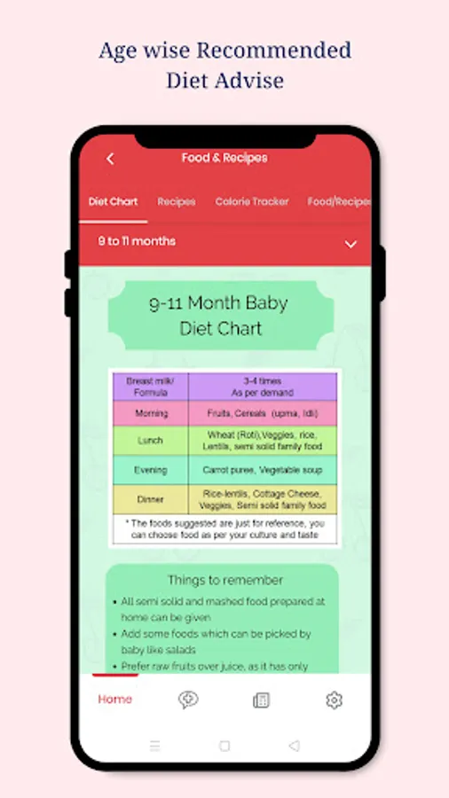 2. Food tracker: In this segment, parents can check nutrition details of all food ingredients and recipes. Age specific baby diet chart are given with all diet related advice. Parents can actually enter all the ingredients and can add a baby recipe, and app will calculate the nutritional details of your recipe. Parents can also count calories taken by their child and compare with recommended calories required by child.