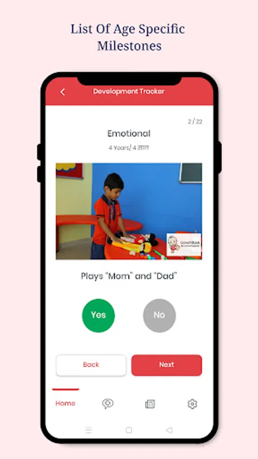 3. Development Tracker: Parents will be able to check child’s development milestones according to age like 2 months, 4 months, 6 months, 9 months, 18 months and 1 to 5 years. Each development milestone is shown with reference photo or a video of kid with the reference age. You can also answer the development milestone according to your child, this will help you to identify any kind of developmental delay and can act early for your child.