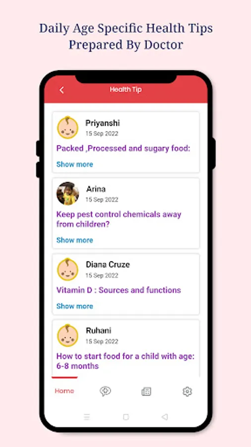 5. Heath tips: Every day a new age specific health tip will come in this section. All health tips are designed and reviewed by a doctor, which ensures that each and every information is precise and correct. As your child will grow you will get a new nonfiction everyday as per child's age. In this section you also get reminders for due vaccines.
