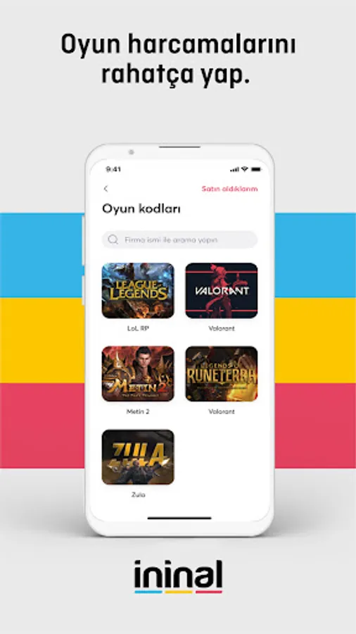 You can easily find and buy game e-pins, membership and wallet codes of the platforms through the ininal application. You can use ininal account information to complete your membership procedures of the music, TV series, movies and all other online platforms.