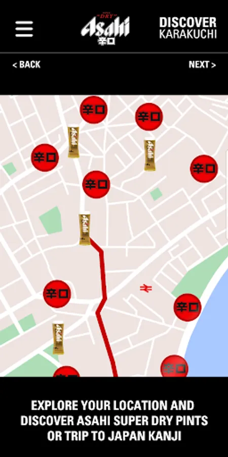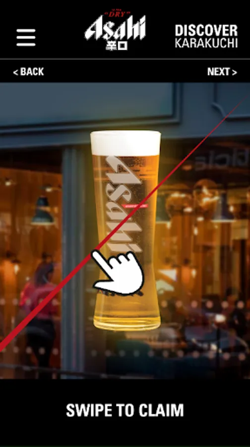 As you explore your surroundings via the augmented reality (AR) Discover Karakuchi app, you will encounter Asahi Super Dry pint glasses available for the taking. Follow the trail, swipe to capture the pint glass, and add an Asahi Super Dry to your wallet.