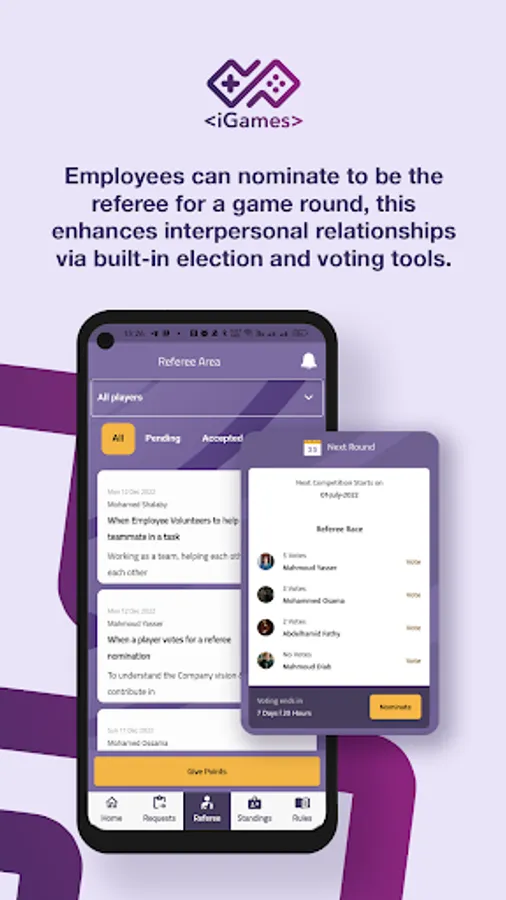 Role-Play: Employees can nominate to be referee for a game round, this enhance interpersonal relationships via built-in election and voting tools.