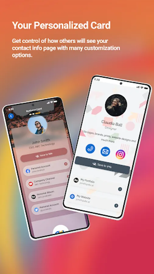 Personalized Profile Page: Get control of how others will see your contact info page with many customization options. Customize colors, cover photo, and much more. Add your photo for more personalization and even control the order of the contact info on the page.