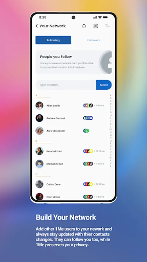 1Me Network: Build your always-updated contacts’ network. If you and your contacts are 1Me users, then you can be added to each other’s network, this will keep each of you updated whenever someone changes contact info. 1Me is always keen on your privacy though, so you will have full control of which contact info you want to share with your network connections. Once your contacts download 1Me, they will always receive updates from you if you change any contact details, like changing work or mobile numbers.