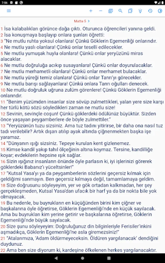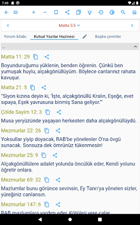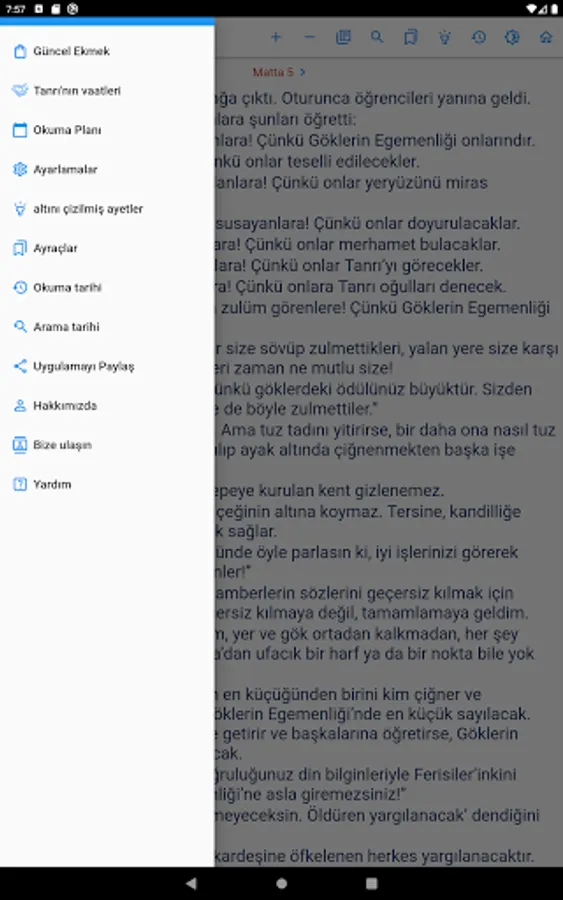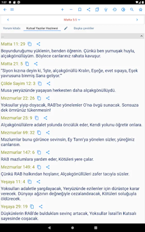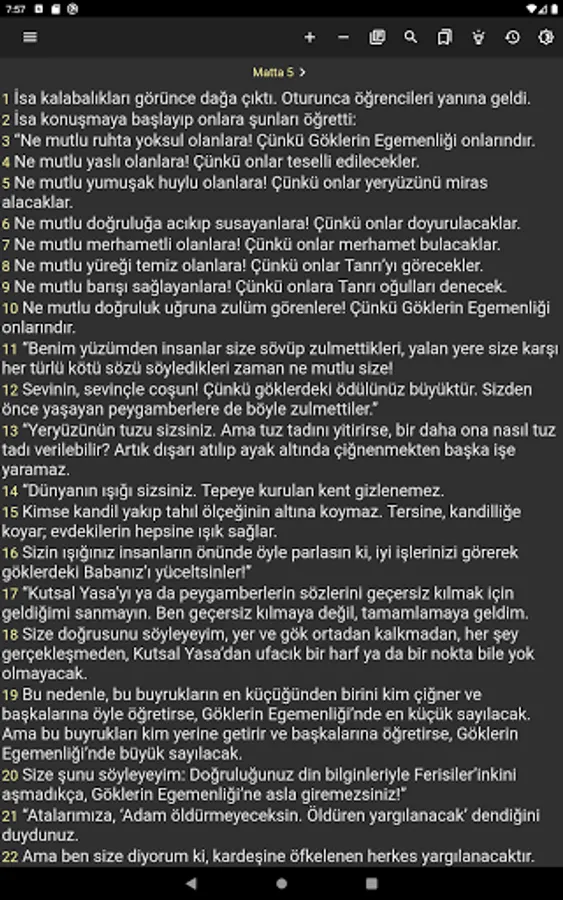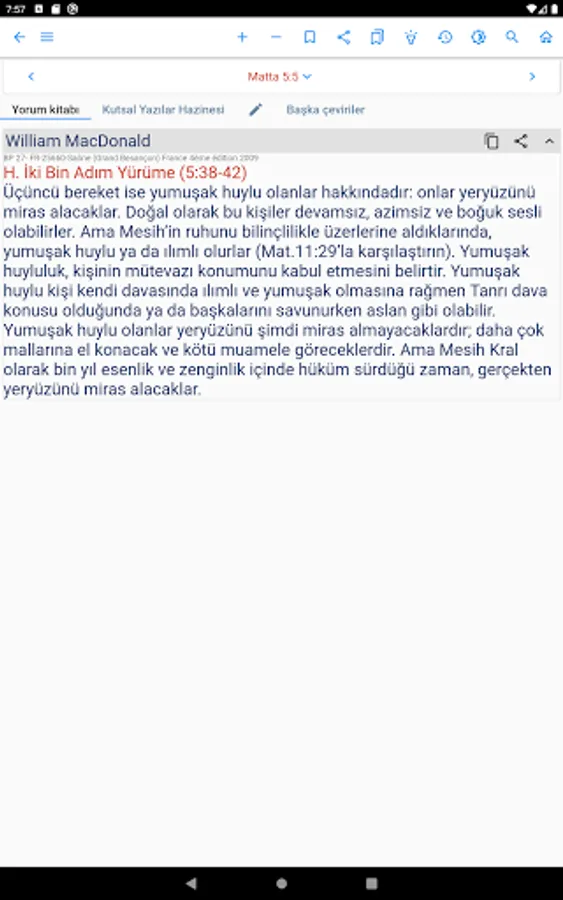 Türkçe Kutsal Kitap Çalışma Merkezi kullanıcıların Kutsal Kitap'ı Türkçe okumaları ve içerikte aramalar yapabilmeleri için tasarlanmıştır. İleri düzey arama özelliklerinin yanında, Türkçe Kutsal Kitap Çalışma Merkezi, tanınmış birçok yazarın yorumlarını da, ayet ayet okuyucularına sunmaktadır. Bu uygulamayla okumak istediğiniz ayete bir dokunuşla erişip, ister yazarların yorumlarını, isterseniz de Kutsal Kitap Bilgi Hazinesine (TSK/KBH) ulaşan bağlantıları veya ayet referanslarını inceleyebilirsiniz. Kullanıcılar diledikleri takdirde, kendilerine dokunan ayetleri sosyal medya aracılığıyla da paylaşabilir, ayetleri istedikleri renklerle işaretleyebilir ve sık kullanılanlara ekleyebilirler.