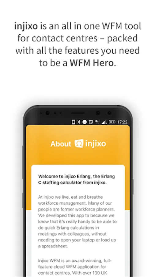 At injixo we live, eat and breathe workforce management. Many of our people are former workforce planners and contact centre experts. We developed this app because we know that it’s really handy to be able to do quick Erlang calculations in meetings with colleagues, without needing to open your laptop or load up a spreadsheet. With injixo Erlang you can do just that. Get your staffing right and achieve your service level consistently. Just open the app on your smartphone and generate quick staff requirement calculations anytime, anywhere.