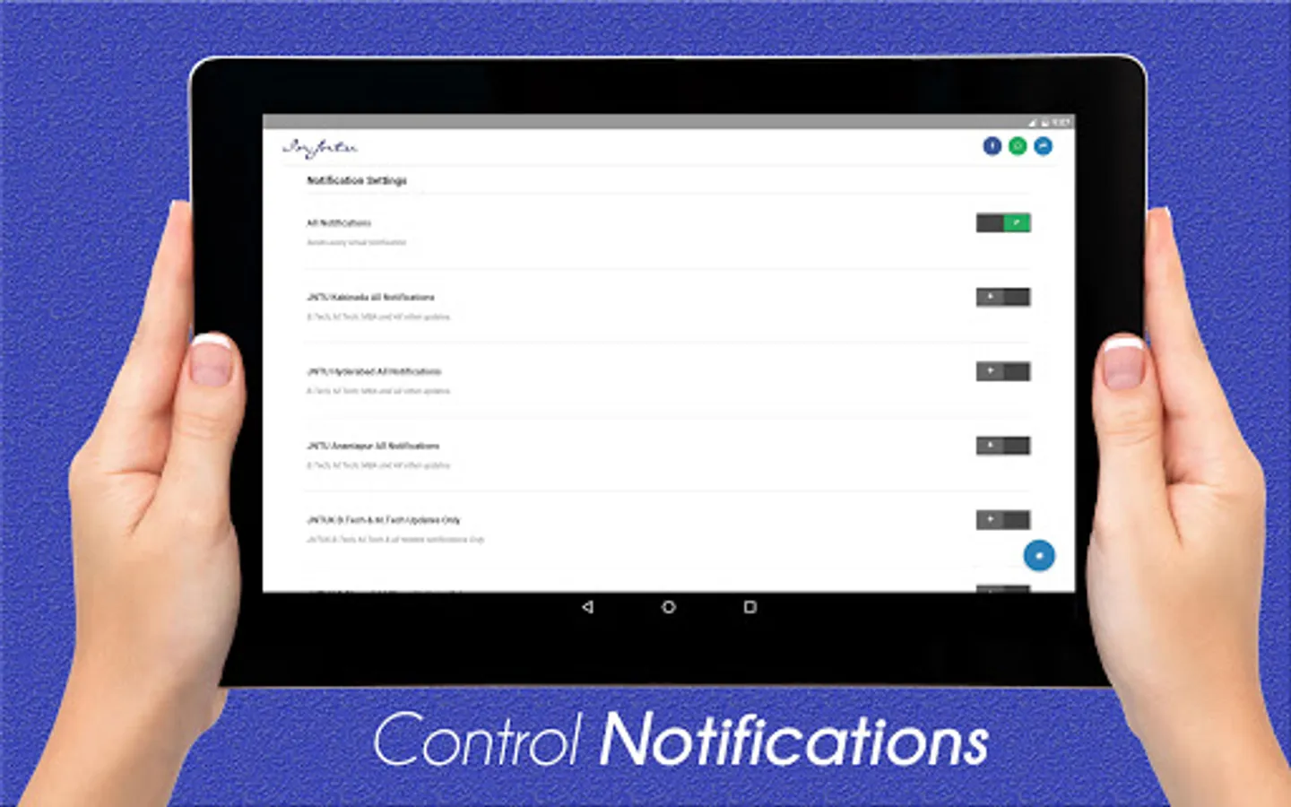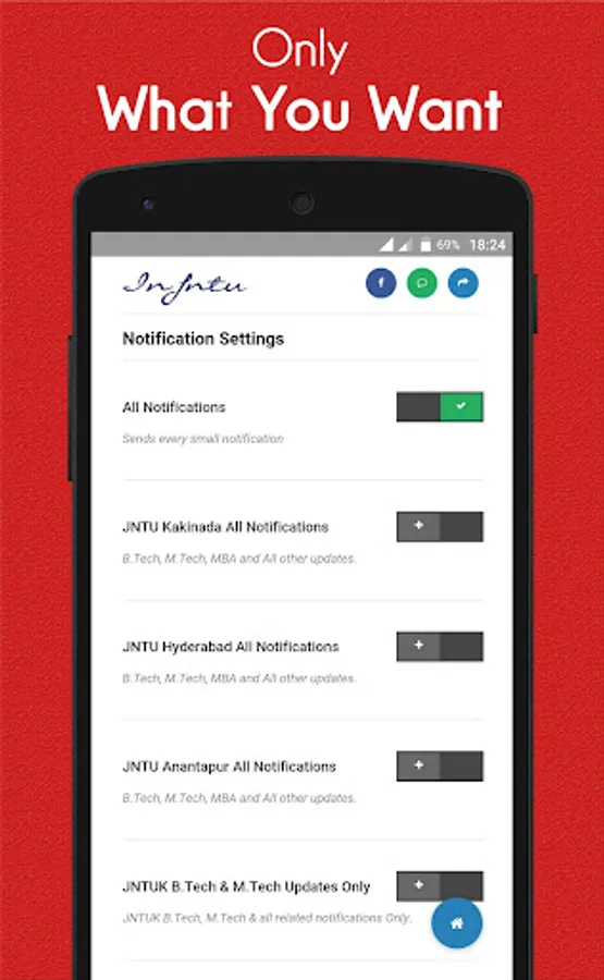 With our latest update you can control notifications for JNTUK BTech, MTech, BPham, MPham, MBA and MCA separately and you can also select university like JNTUK, JNTUH, JNTUA.