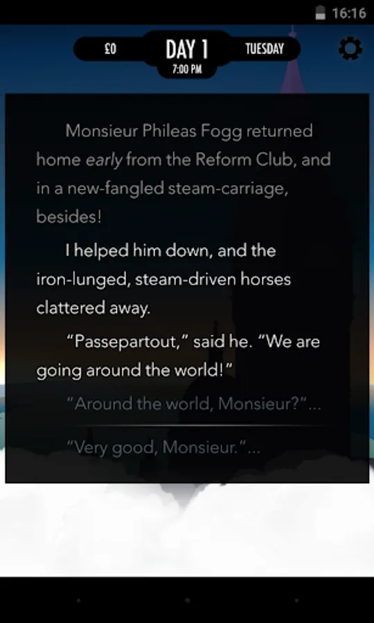 Every city and journey is narrated via an interactive story where you control every action. Will your choices speed you up - or lead you into disaster? Will you earn Fogg's trust and respect? Will you uncover the secrets and short-cuts that can shave days off your time? Murder, romance, rebellion and intrigue await!