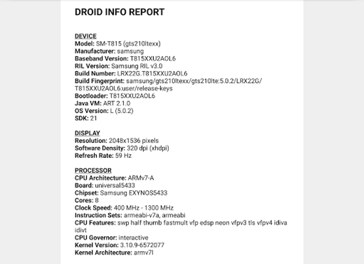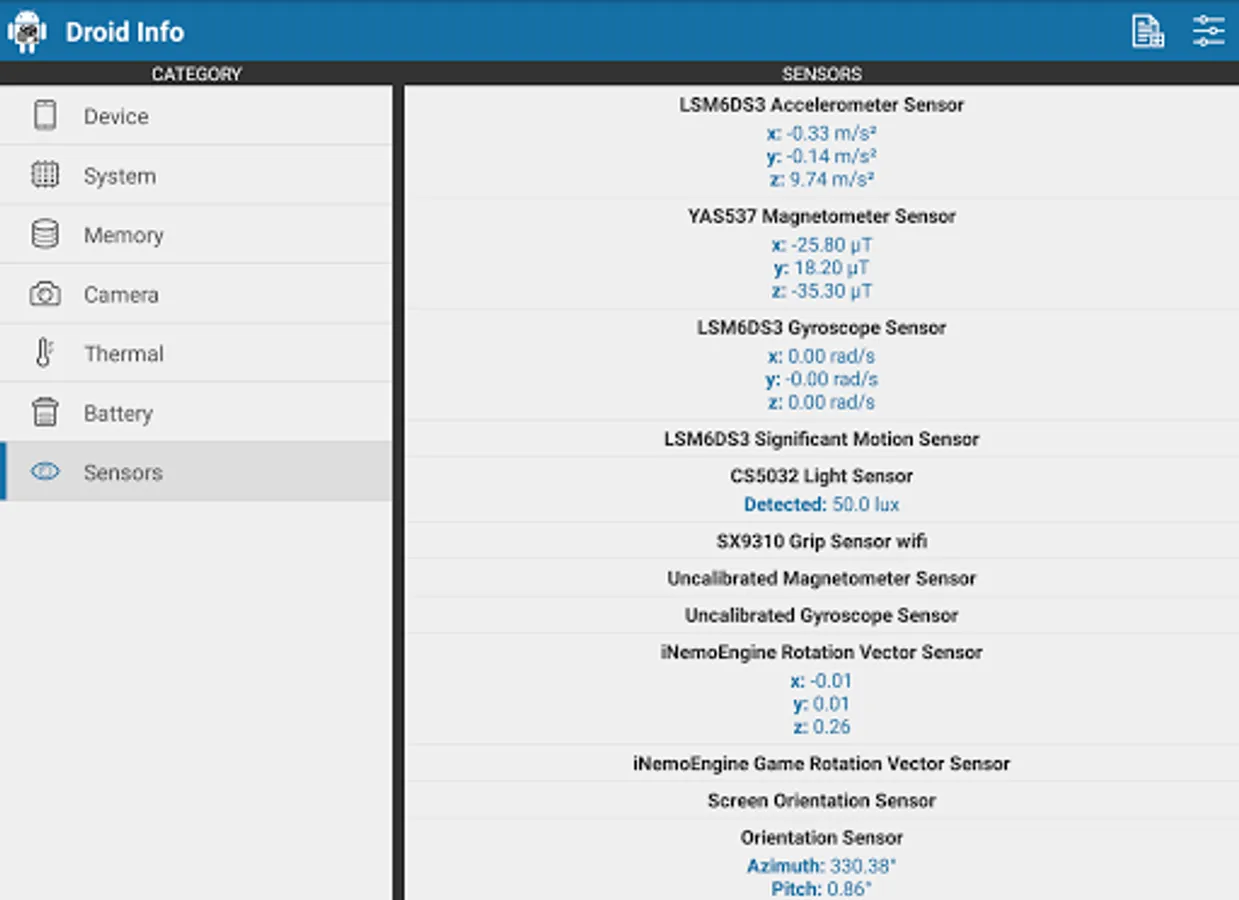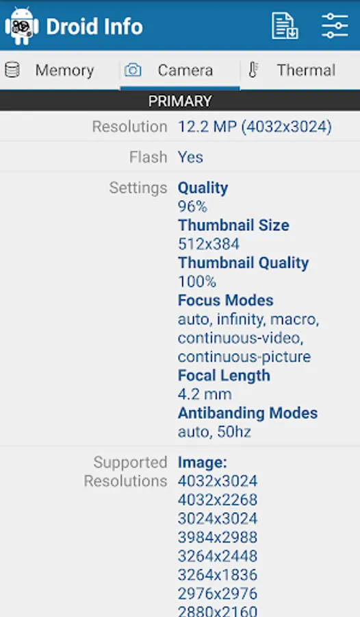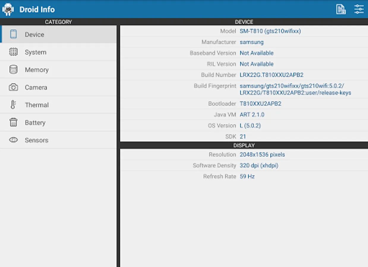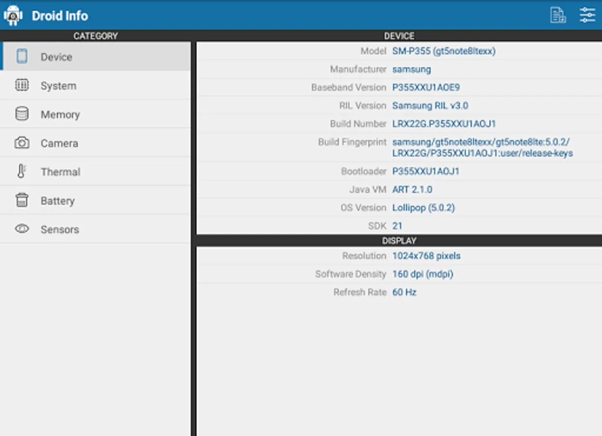 Droid Info is a hardware information app for Android with detailed information about your smartphone including device, system, memory, camera, temperature, battery and sensor details. You can also export full report of your Smartphone.