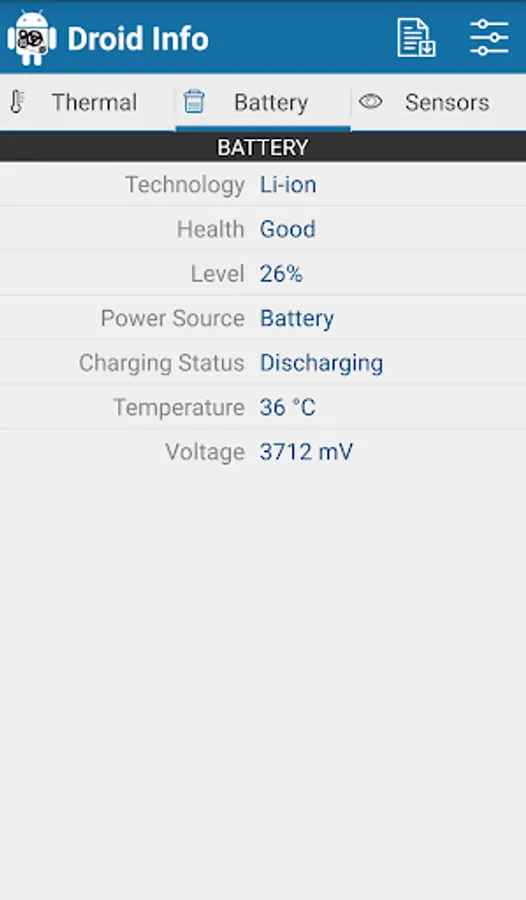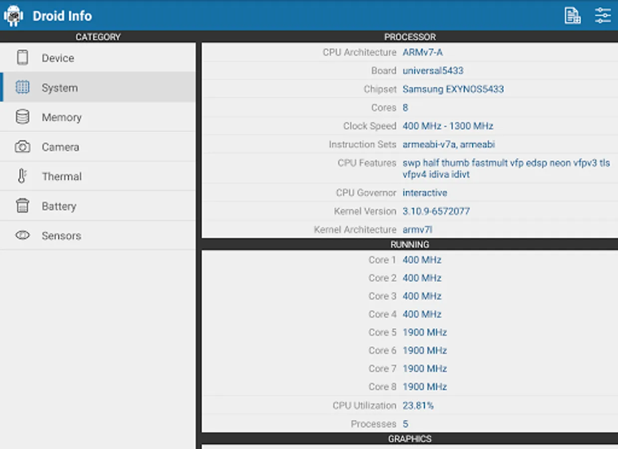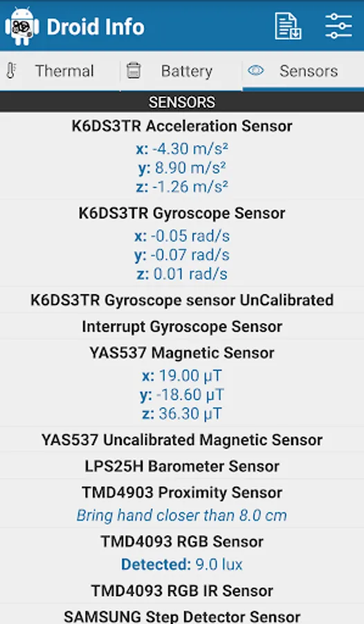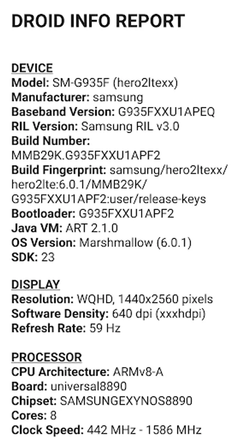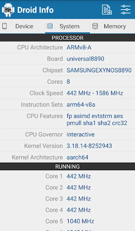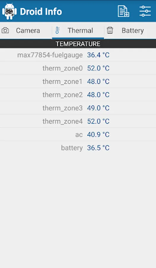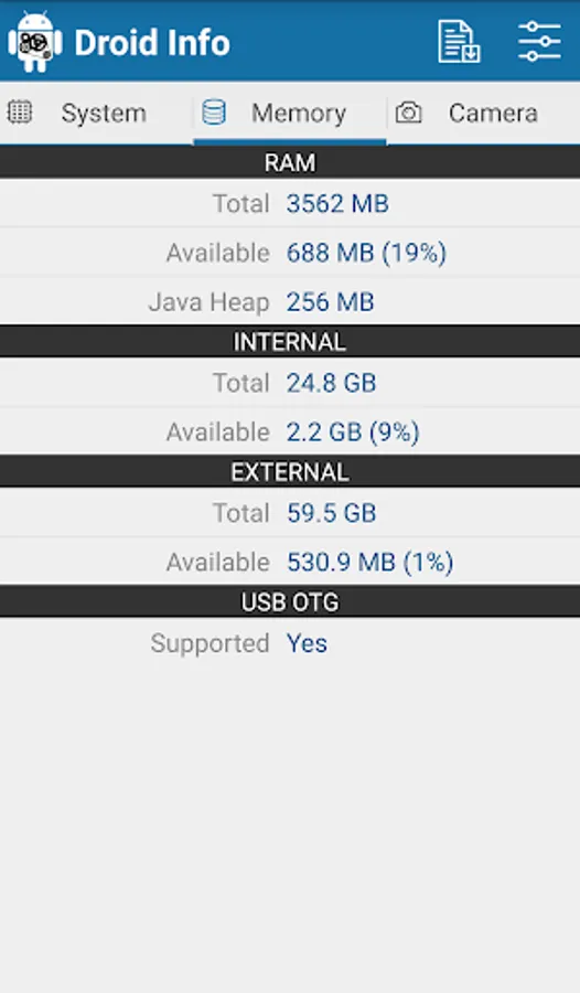 Droid Info is a hardware information app for Android with detailed information about your smartphone including device, system, memory, camera, temperature, battery and sensor details. You can also export full report of your Smartphone.