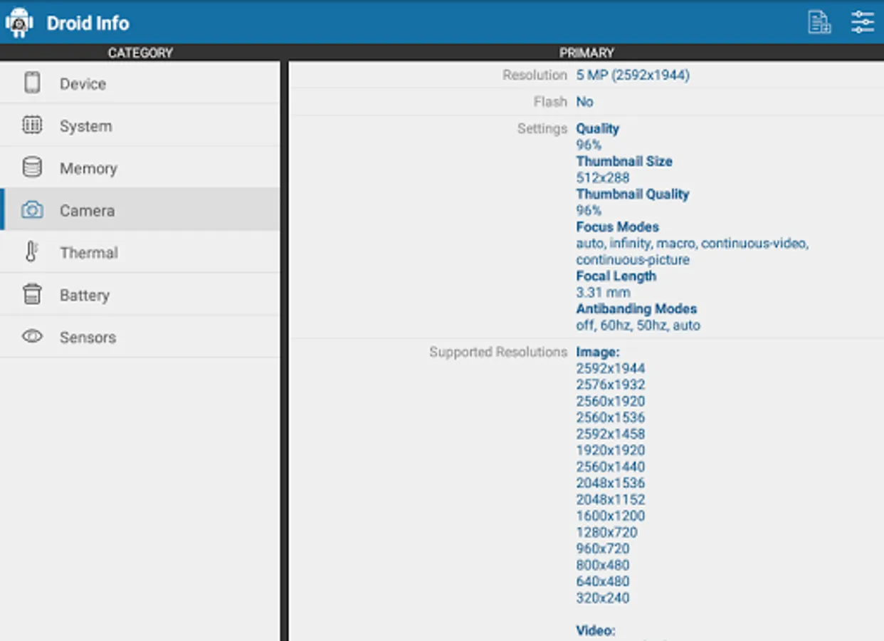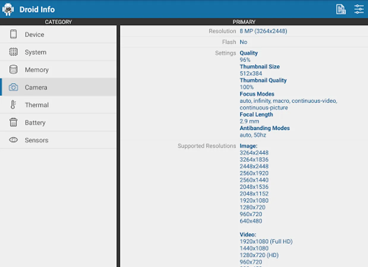 – Camera: Detailed information about the primary and secondary camera in your phone. Along with supported resolutions, focus modes and AntiBanding modes.